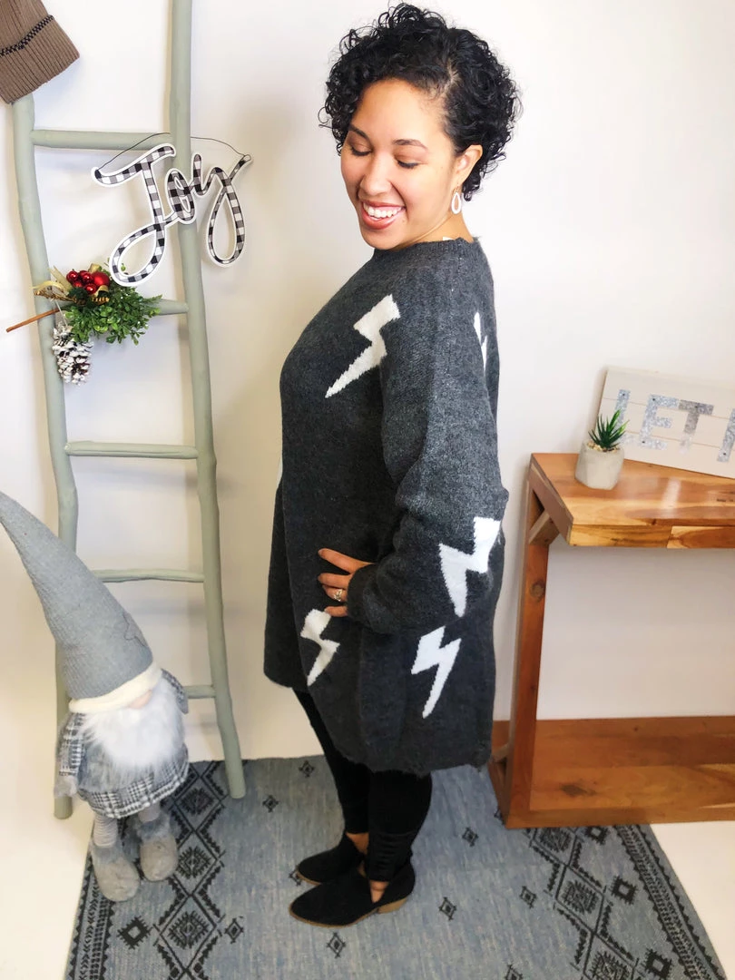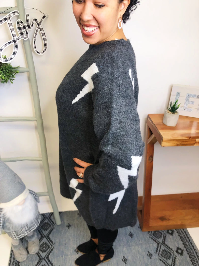 This super cute sweater is gorgeous! It’s charcoal and has a crew neck. It features lightning all around the sweater and is so beautiful!! The material is super soft!! This will be your new favorite sweater!!Β
