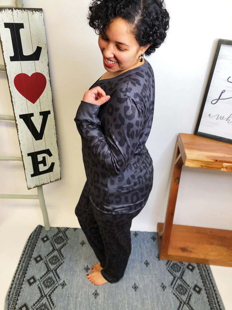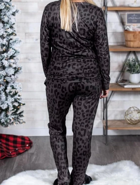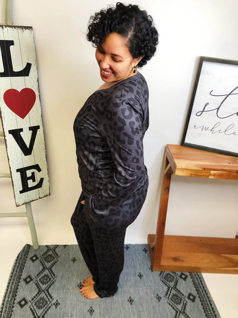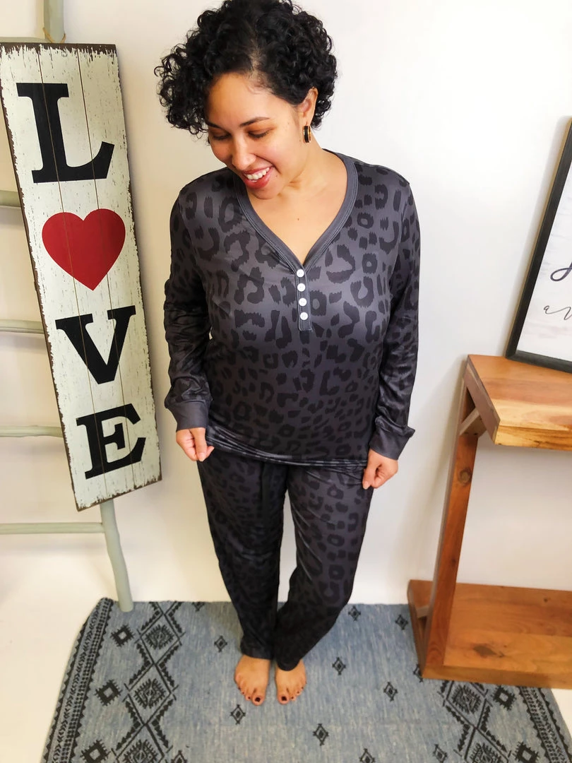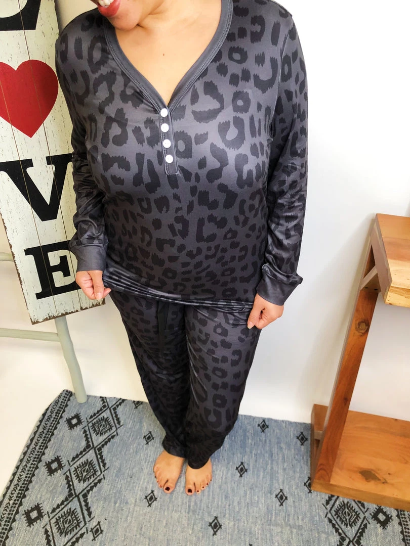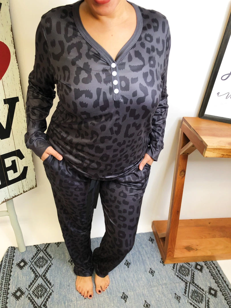 These daily wear pajamas are SO beautiful!!! It features a v-neckline with four small buttons!!! And the bottoms feature pockets and a drawstring! It also has a black leopard print on it!!! It’s just the most amazing pajamas ever! You’re gonna love it!Β