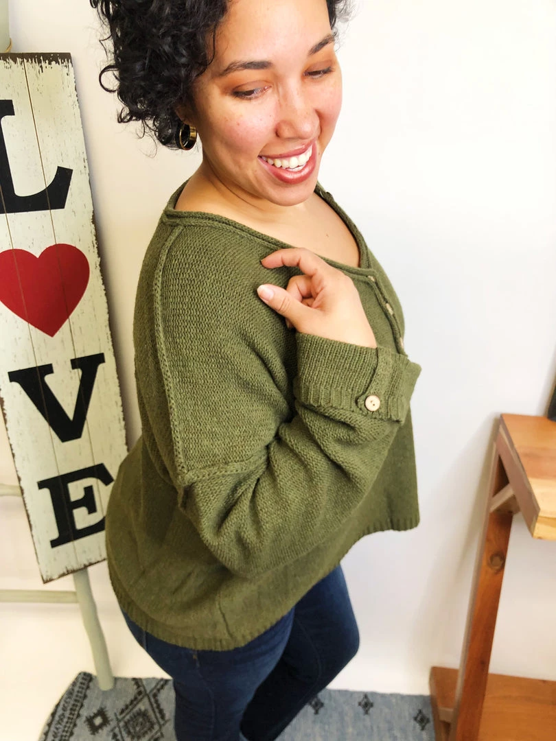 This sweater is gorgeous!!! It has long sleeves, solid knit with a v-neck featuring bell sleeves and non-functional buttons!!! The fabric is a medium weight sweater knit!!! This sweater is gonna make your outfit looking amazing! You won’t regret owning this!!!
