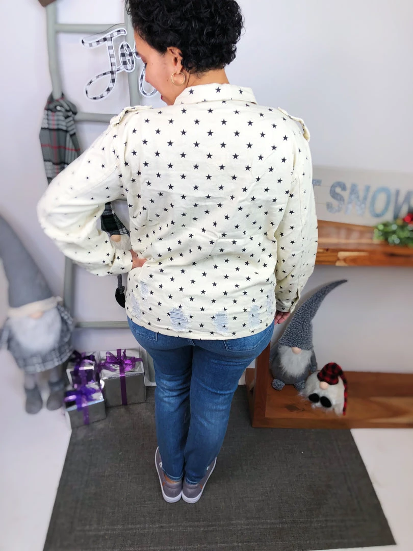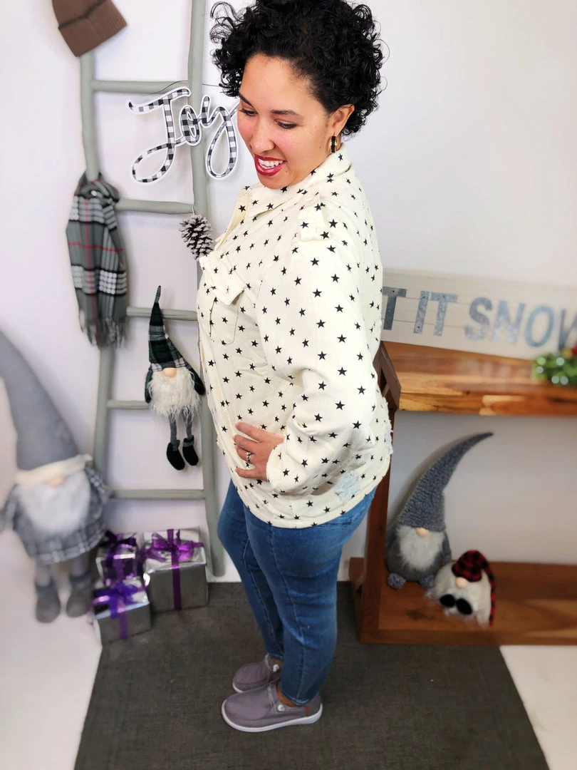 This cream button down shacket has a wash star print! It’s the cutest thing ever! It is a beautiful piece featuring long sleeves and front breast pockets! The material in this shacket is lightweight and soft. You’re gonna be wearing this over and over!