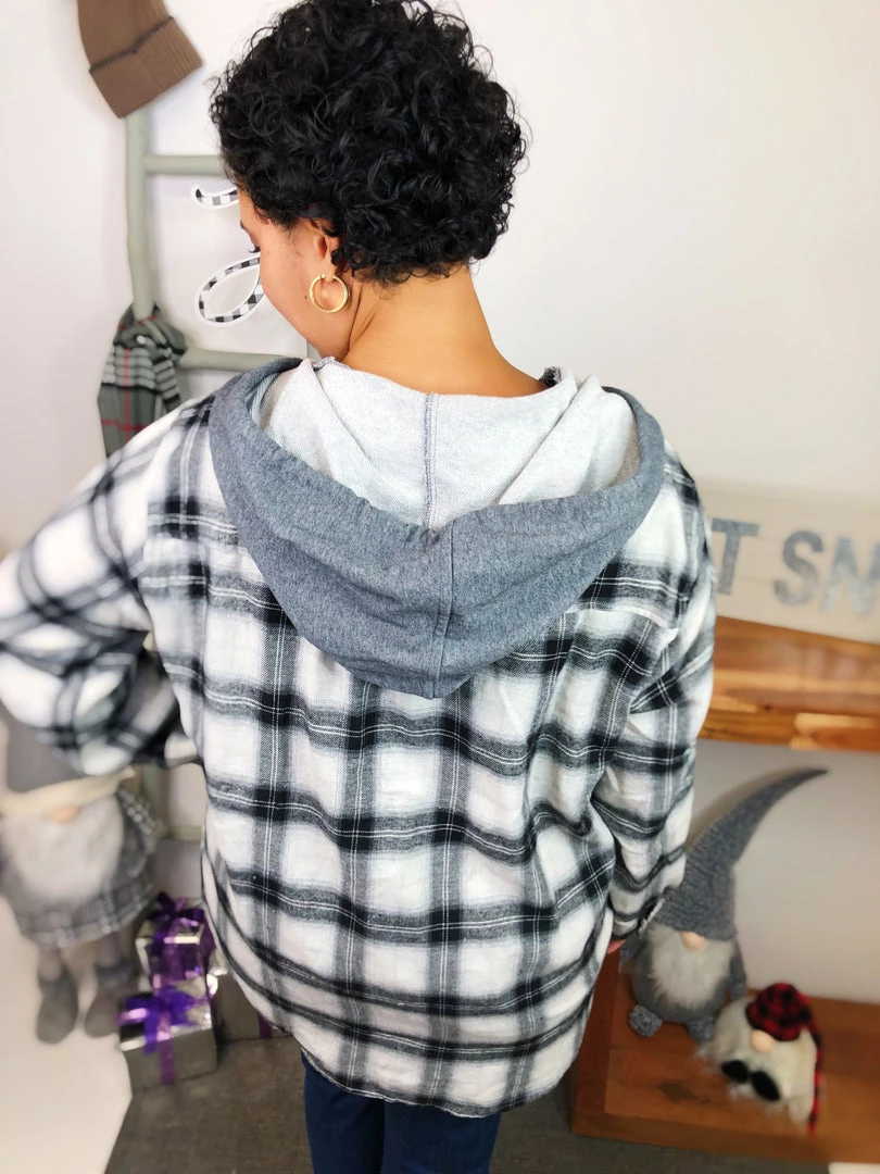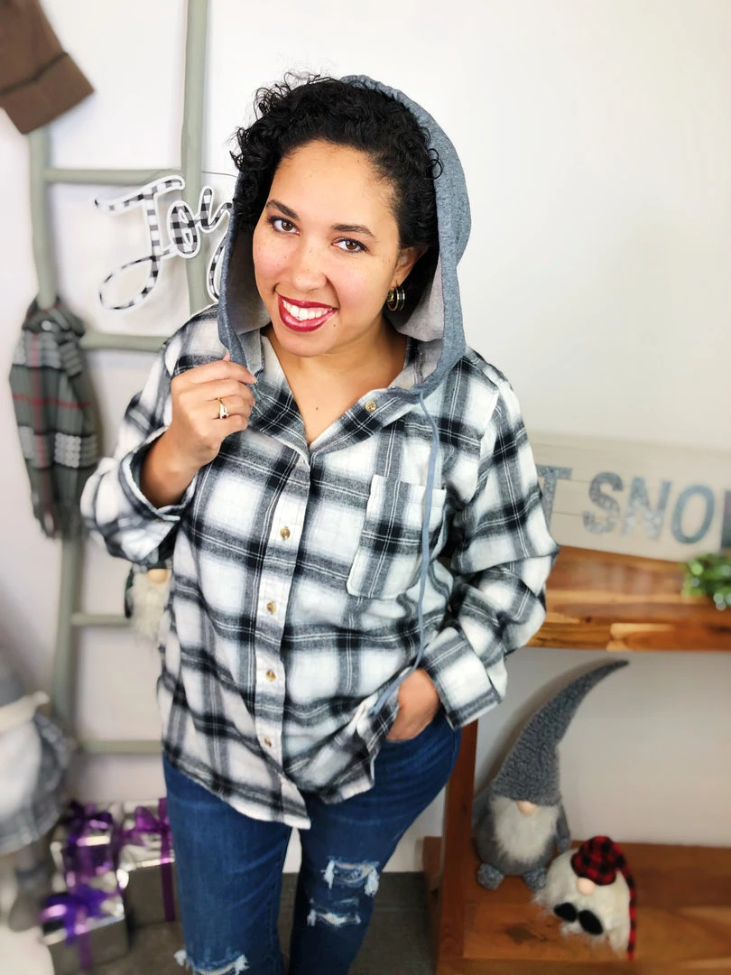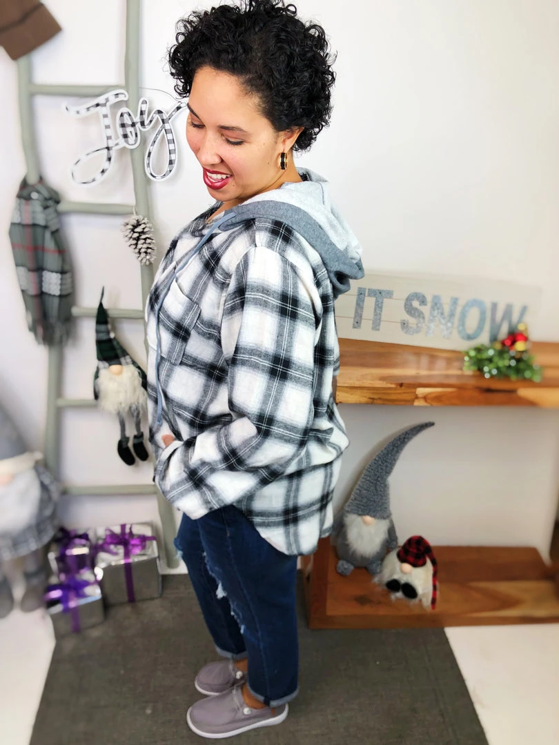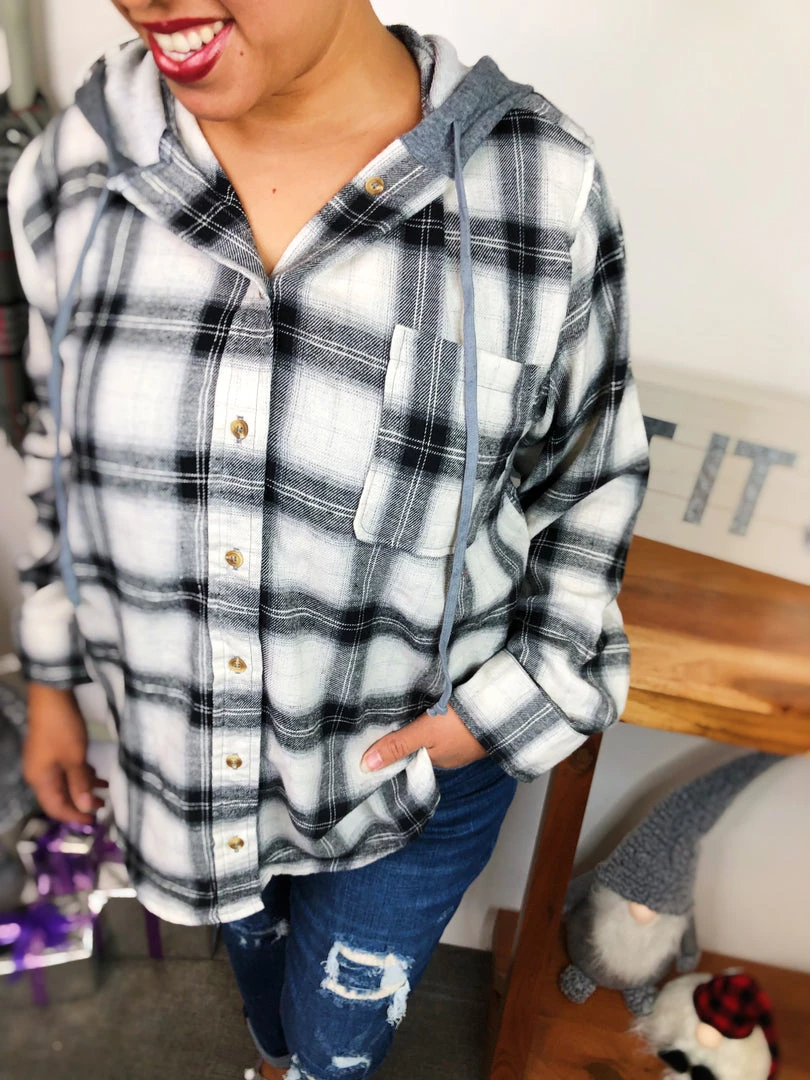 This plaid hoodie is a MUST HAVE piece! It has a black and white plaid print featuring a button down front, hood with drawstring and a rounded bottom hem! This hoodie also has a chest pocket and a loose/relaxed fit! It’s so good that I can’t even believe that is true! And the material in this is really soft and lightweight! You’re gonna love it!