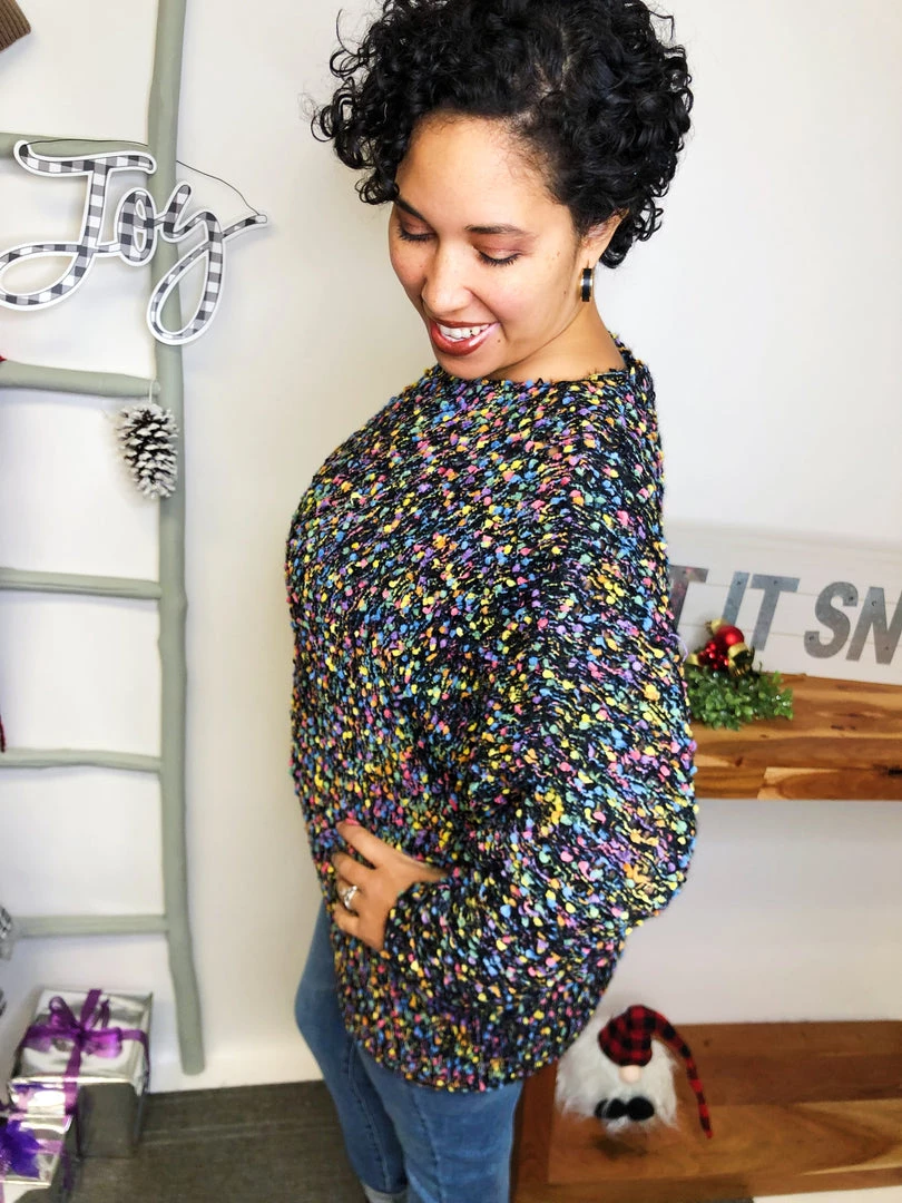 This sweater is so cute!!! It is black with multiple colors on it! It’s just like raining happiness! It has a round neck and long sleeves. And the material in this sweater is so soft and the stretch is incredible!!!Β You’re gonna love this sweater!Β
