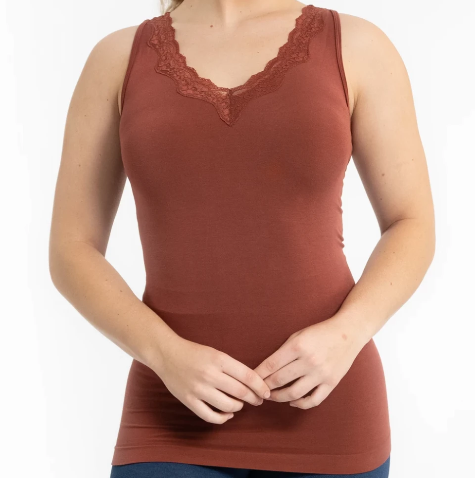 This beautiful stretchy reversible tank has a lace lined v-neck. This tank can be layered or worn as is!Β