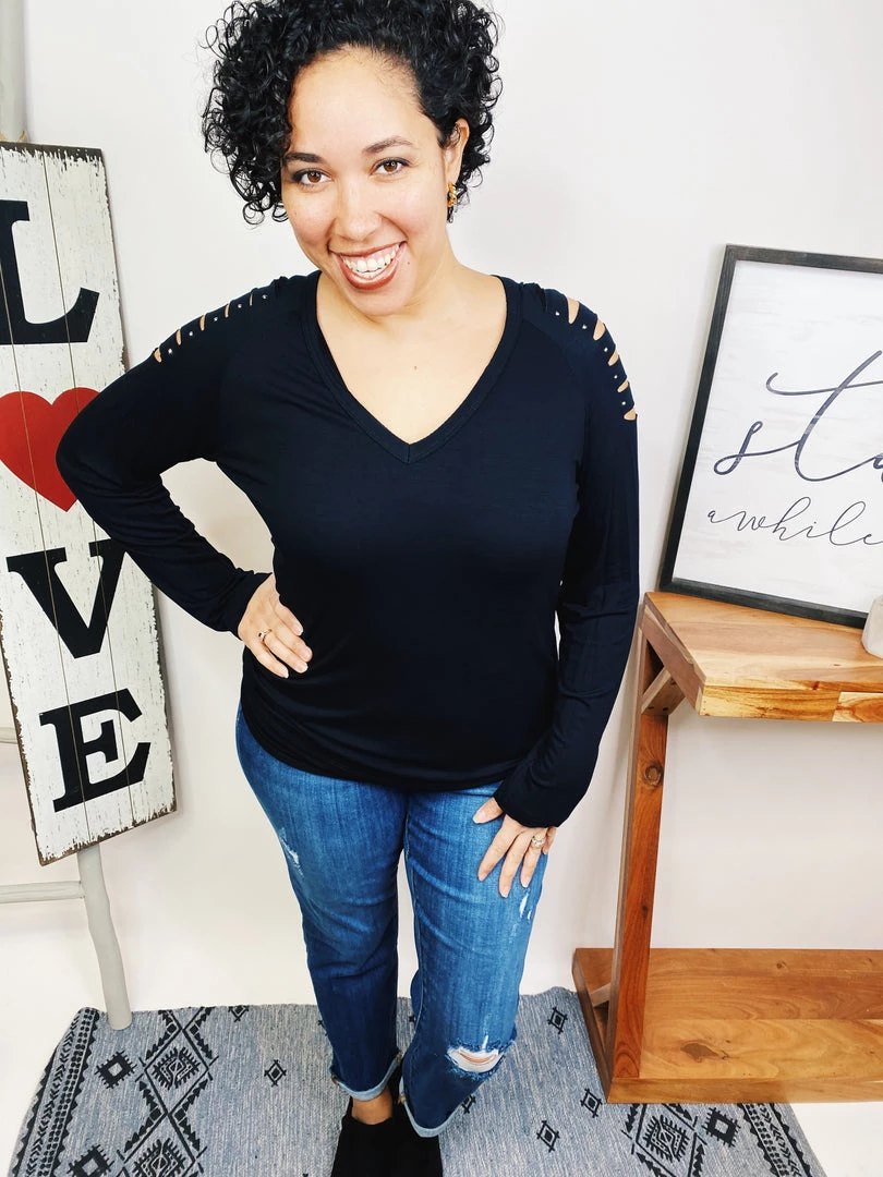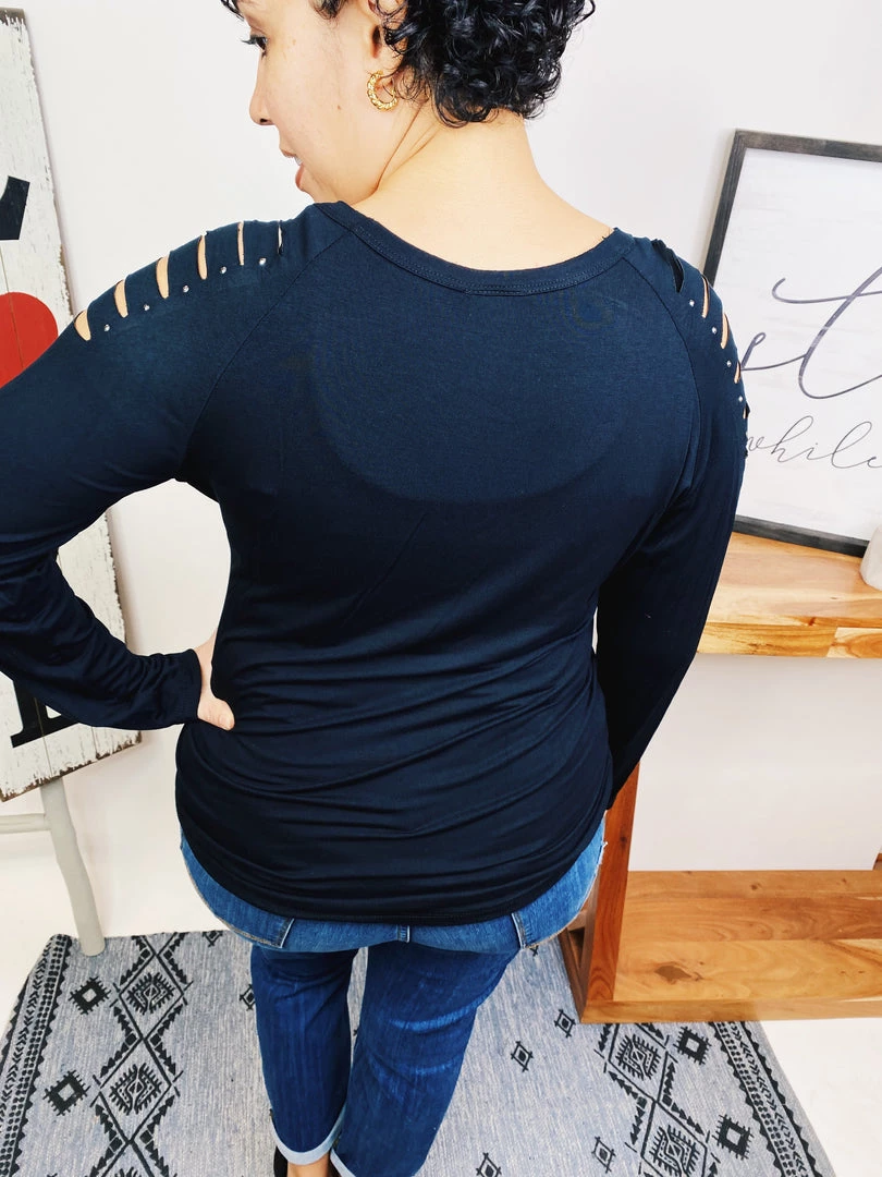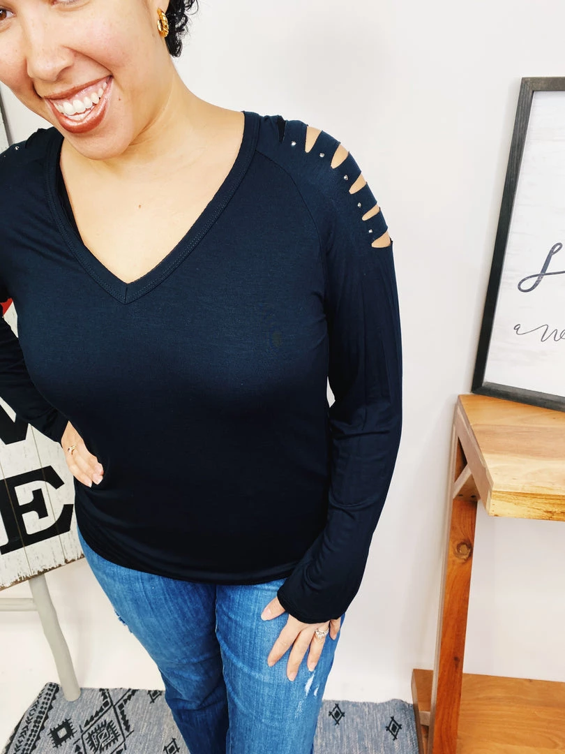 This vocal top is so beautiful!!! That’s the kind of top that goes well with anything! It has long sleeves with laser cut and stones! This is gonna look so good on you, girl!! And the material is really soft and lightweight! You’re gonna love it!!!