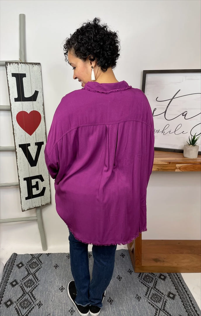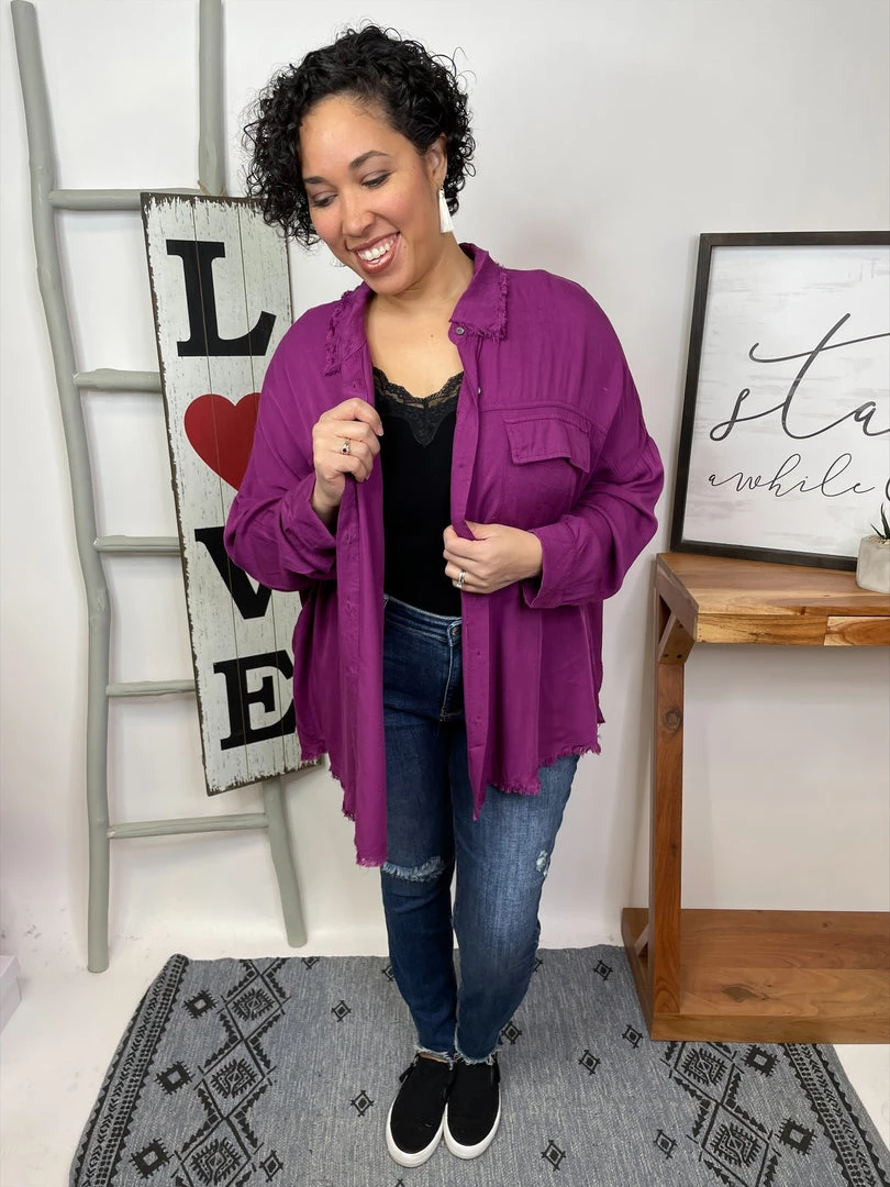 This top is SO beautiful!! It is aΒ long sleeve solid woven top with a button down front featuring pockets and a frayed hemline! And the fabric is a lightweight woven rayon!!! Get ready to make your outfit looking stunning with this! You’re gonna love it!