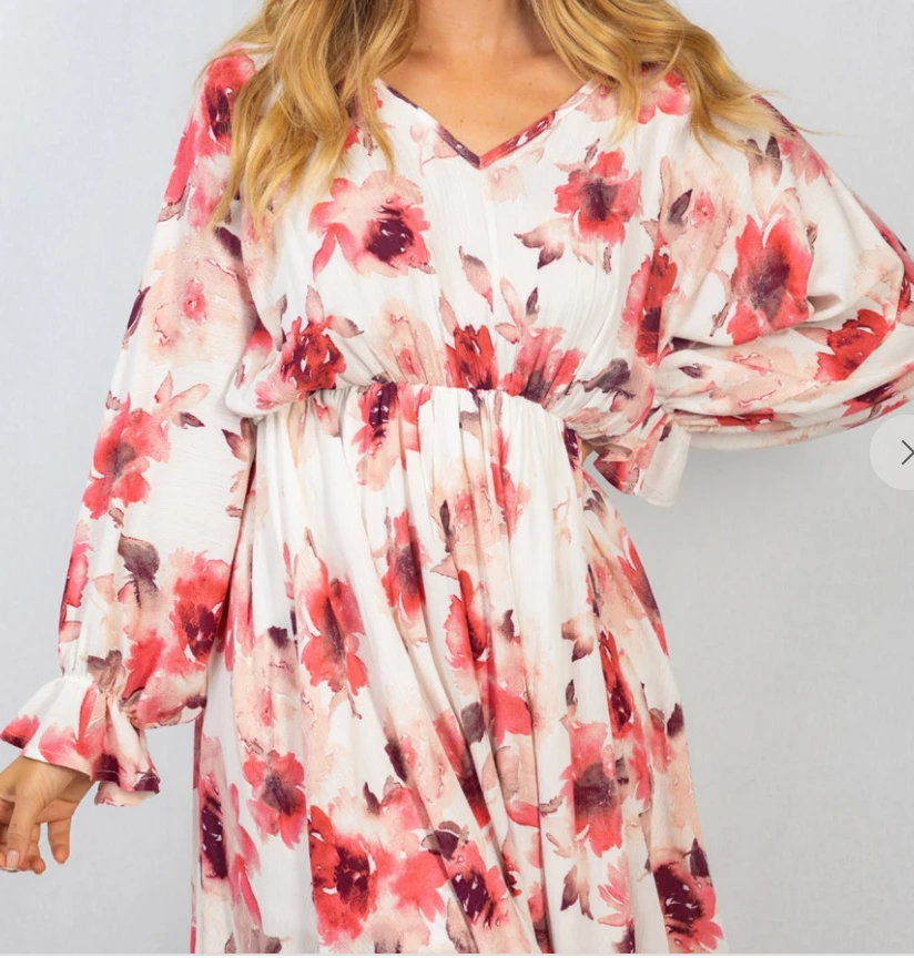 This dress is GORGEOUS! It’s aΒ long sleeve floral print knit dress with a V-neck featuring and elastic waist and true-to-size fit! The fabric is a lightweight rayon crepon knit!!! This is a masterpiece, girl! Get ready for a lot of compliments when wearing this!
