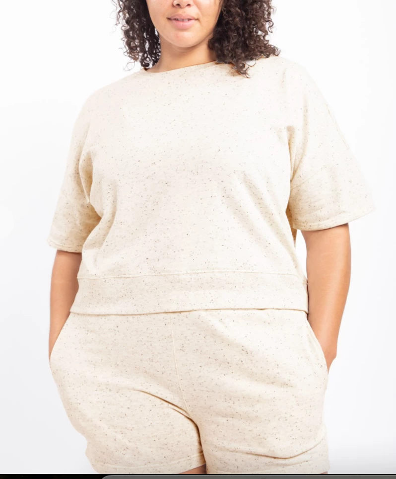 Who doesn’t love a set perfect for lounging the day away and chic enough to wear out and about. The short sleeve top cuts a cropped silhouette with slightly longer sleeves while the shorts feature an elasticized waistband, pockets, a single back pocket, and fall at about quarter thigh length.