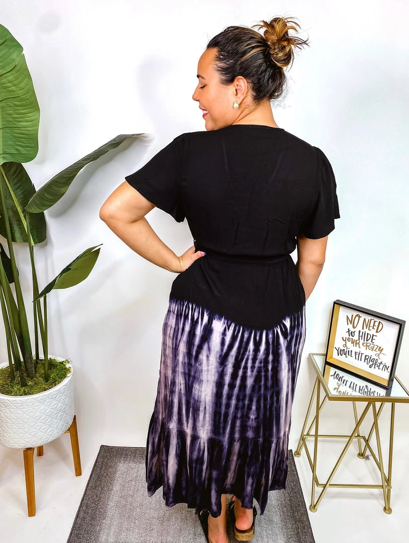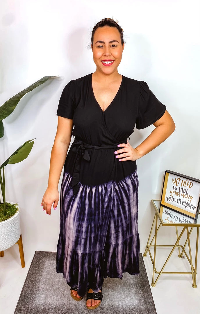 This dress is beautiful! A short sleeve tie-dye woven dress with a surplice front featuring an elastic waist and an adjustable self tie. Fabric is a lightweight woven material! You’re gonna love wearing this!