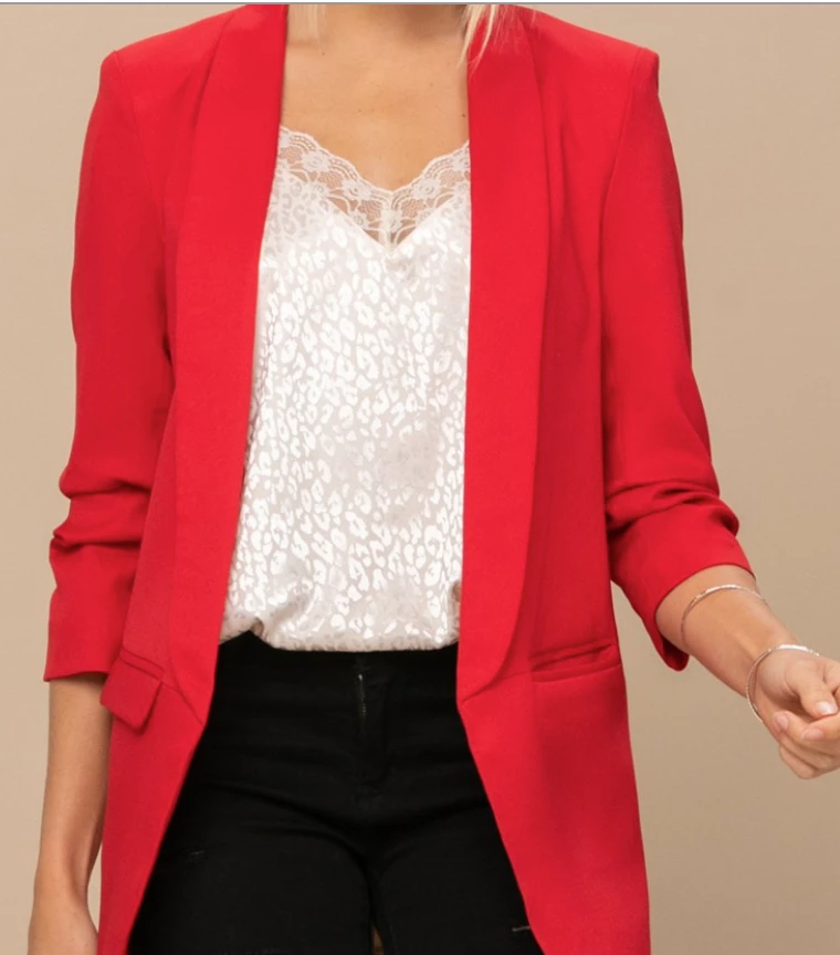 This blazer is GORGEOUS!Β Solid woven collared blazer featuring 3/4 length ruched sleeves! I’m telling you, girl this piece is gonna add a lot of style and personality to your outfit! You’re gonna love it!