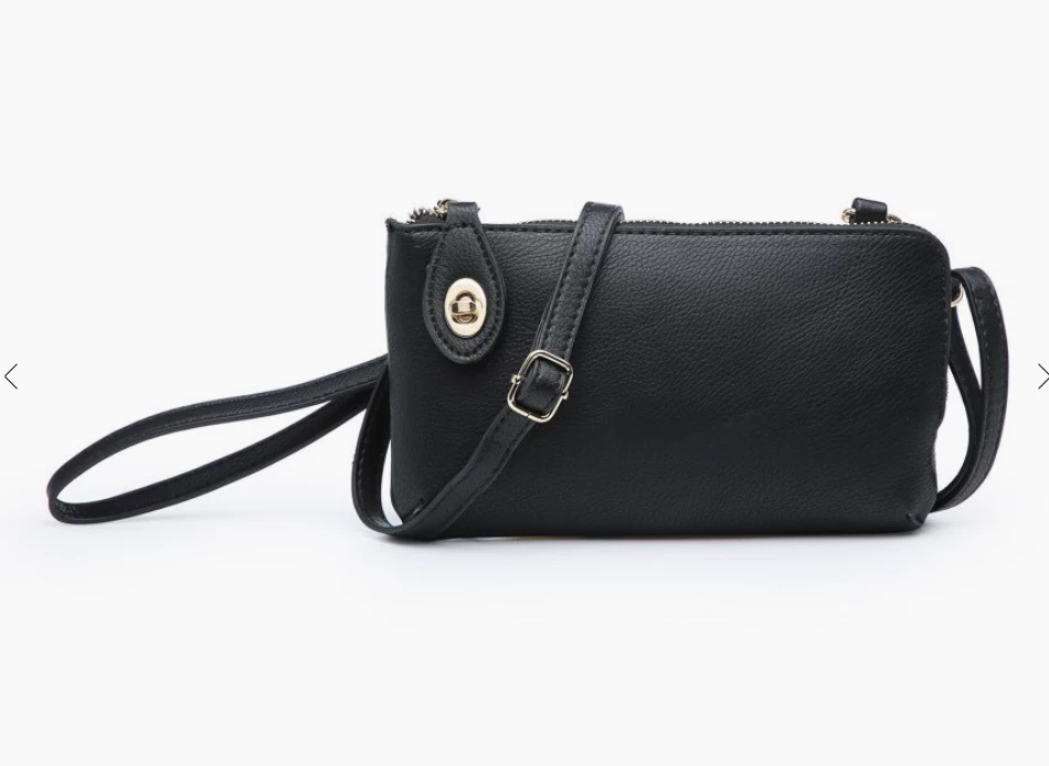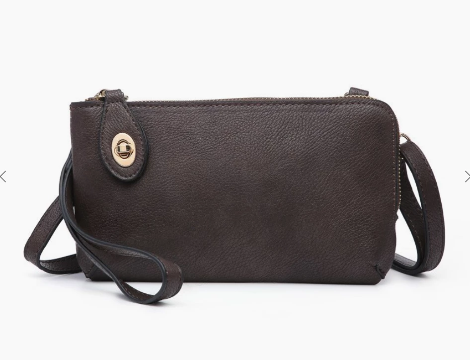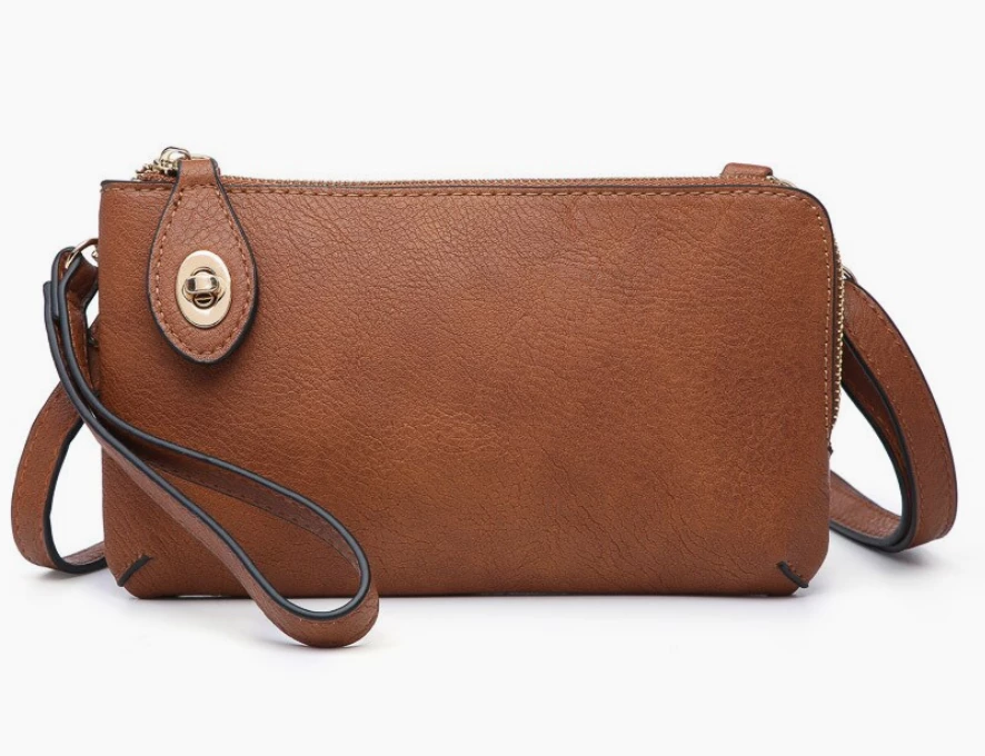 Monogrammable Main center zip compartment Twist lock closure Adjustable shoulder strap Inner cardholders Detachable wristlet strap Vegan leather