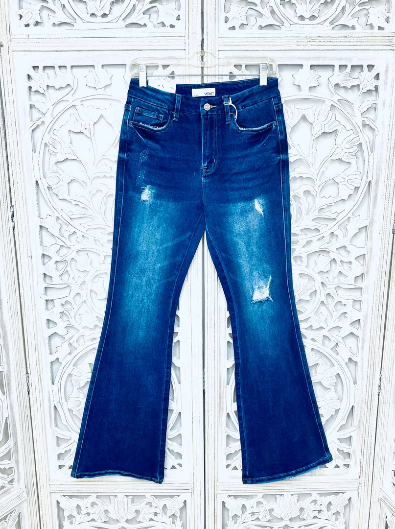 These Vervet Jeans high rise seamless waistband distressed flare are AMAZING! TheyΒ have amazing stretch which isΒ the best combination ever and it makes themΒ super comfortable. Without doubt they are going to be your new everyday jeans!Β You will love pairing these versatile jeans with any outfit!Β