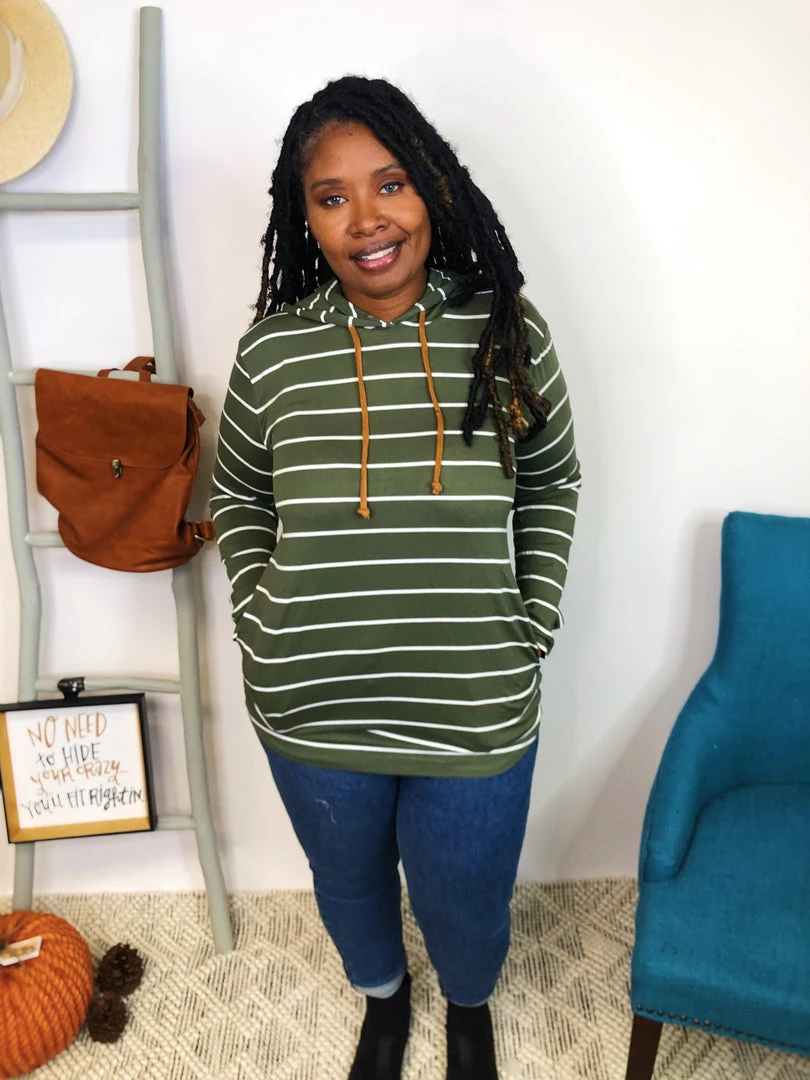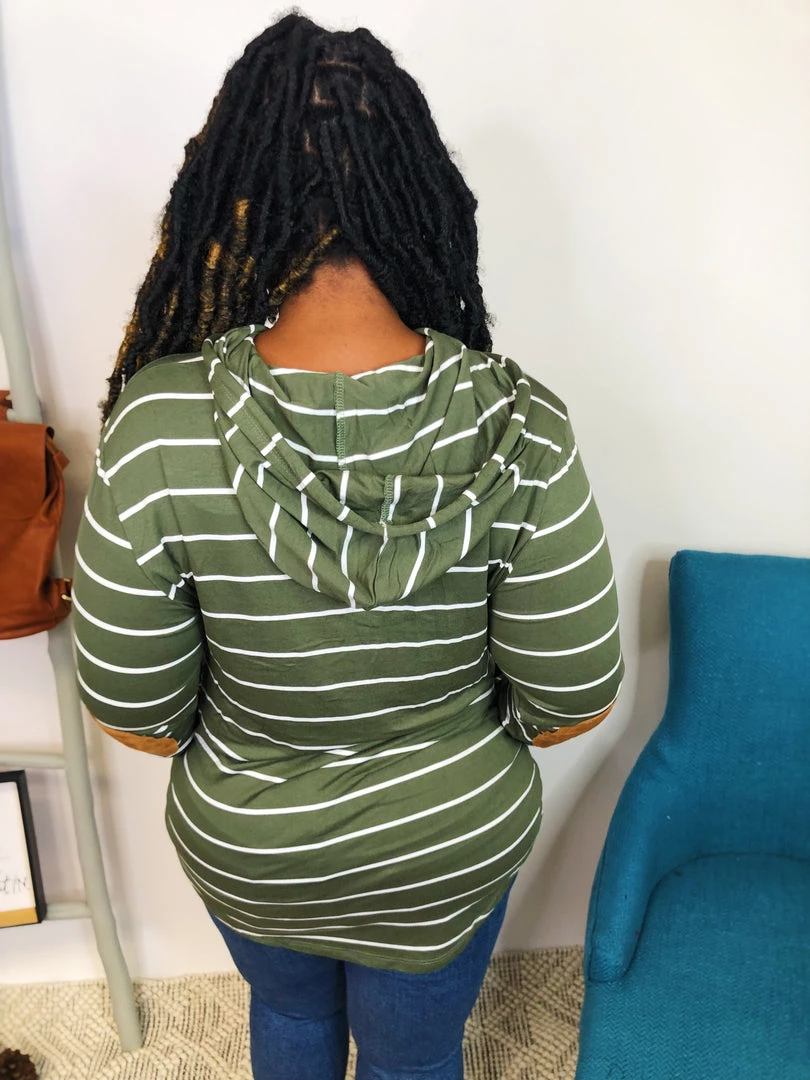 It’s back! One of our bestselling hooded tops is back in stock. This lightweight hoodie is olive colored with white stripes and brown suede elbow patches on the sleeves. It has a brown suede drawstrings on the hood and side pockets. The hem line is rounded in both the front and back so you can have the most flattering fit! Snag this gorgeous hoodie before it’s sold out again!Β