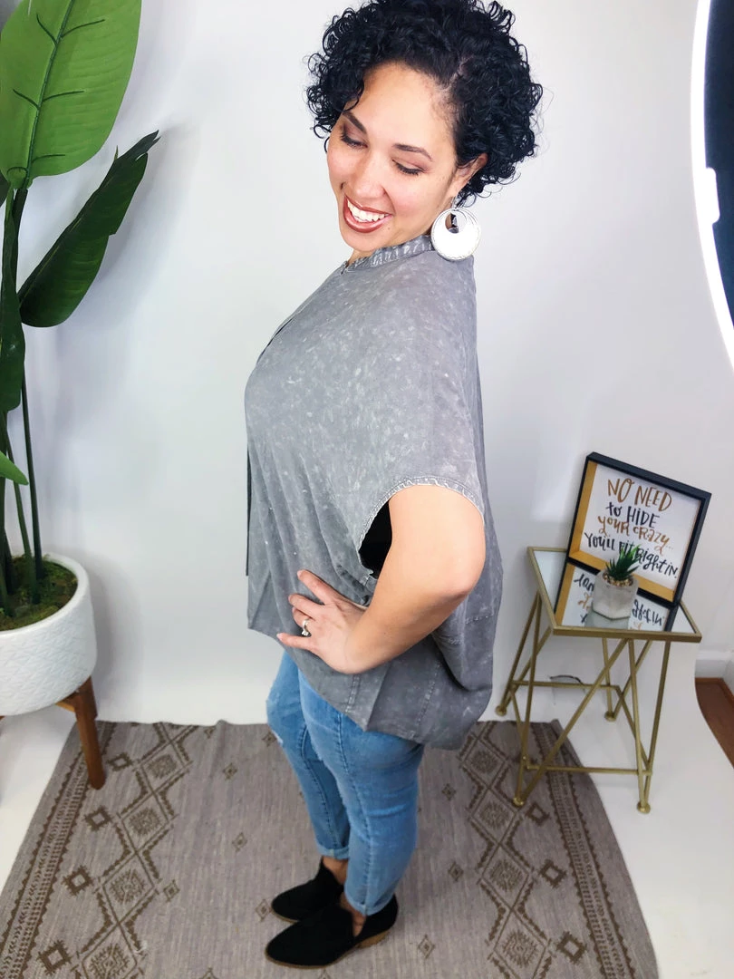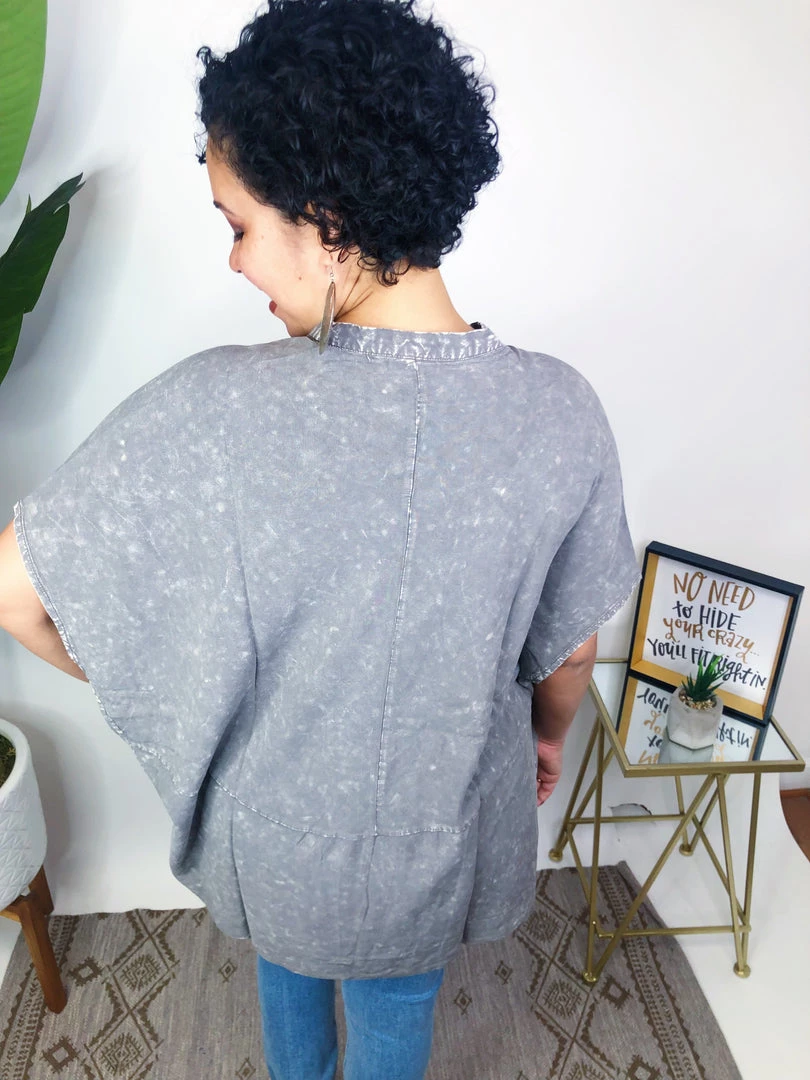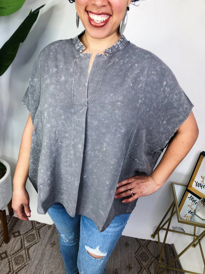 This top is SO beautiful!!!!Β MINERAL WASHED LOOSE FIT TOP -COLLARED AND V NECKLINE -LOOSE FIT AND OVERSIZED SILHOUETTE -SHORT DOLMAN SLEEVES -LONGER TUNIC LENGTH FOR ADDED COVERAGE! YOU’RE GONNA LOVE IT!