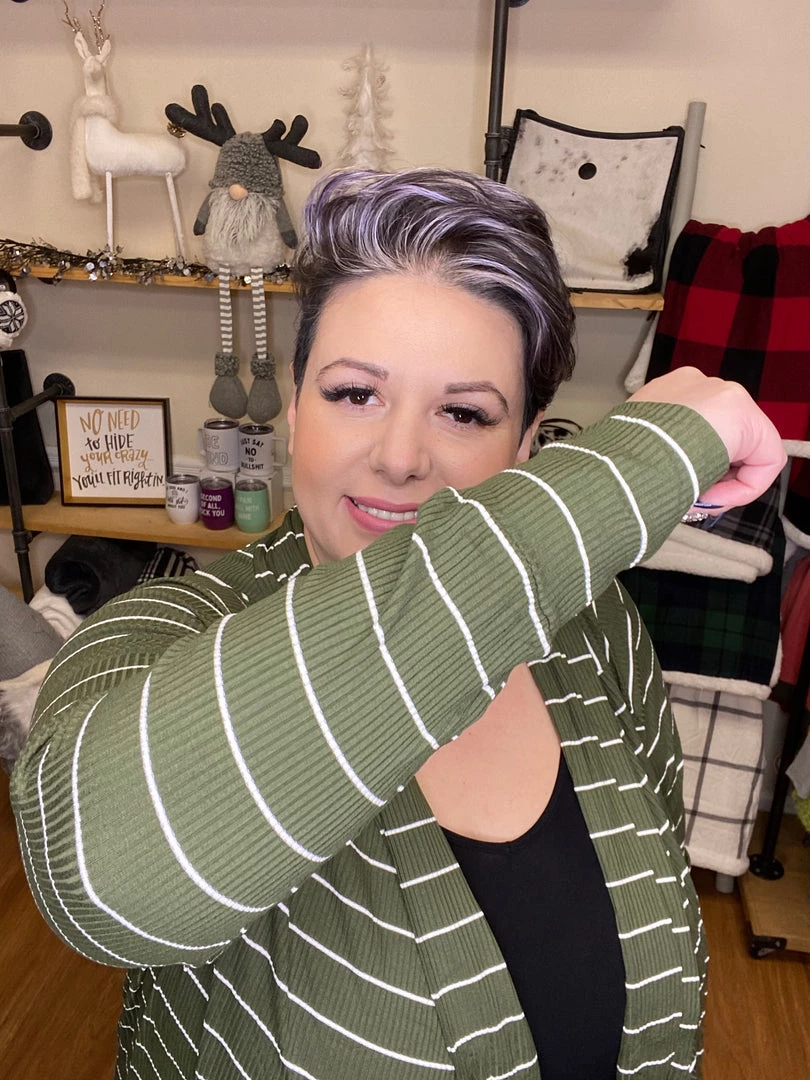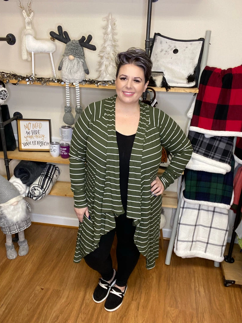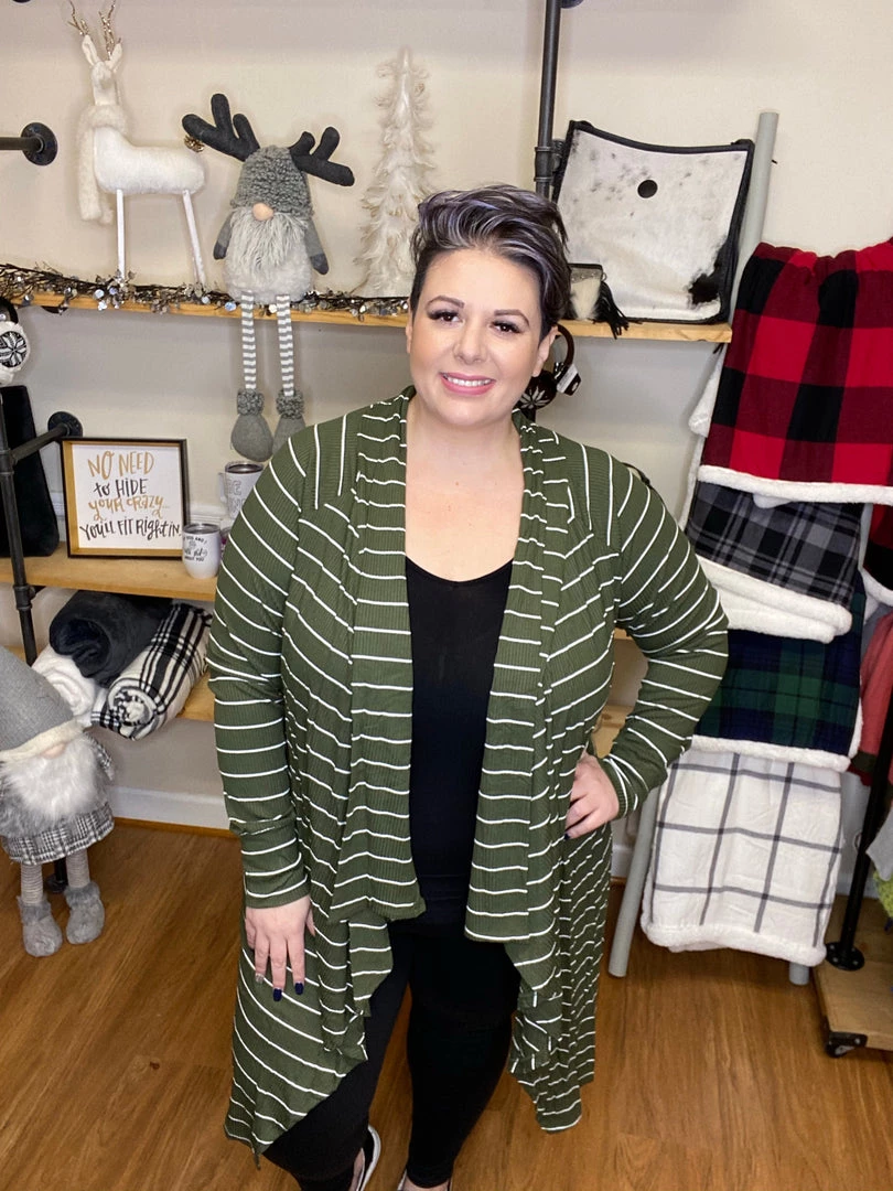 - Super cute olive striped cardigan, a perfect layering piece!