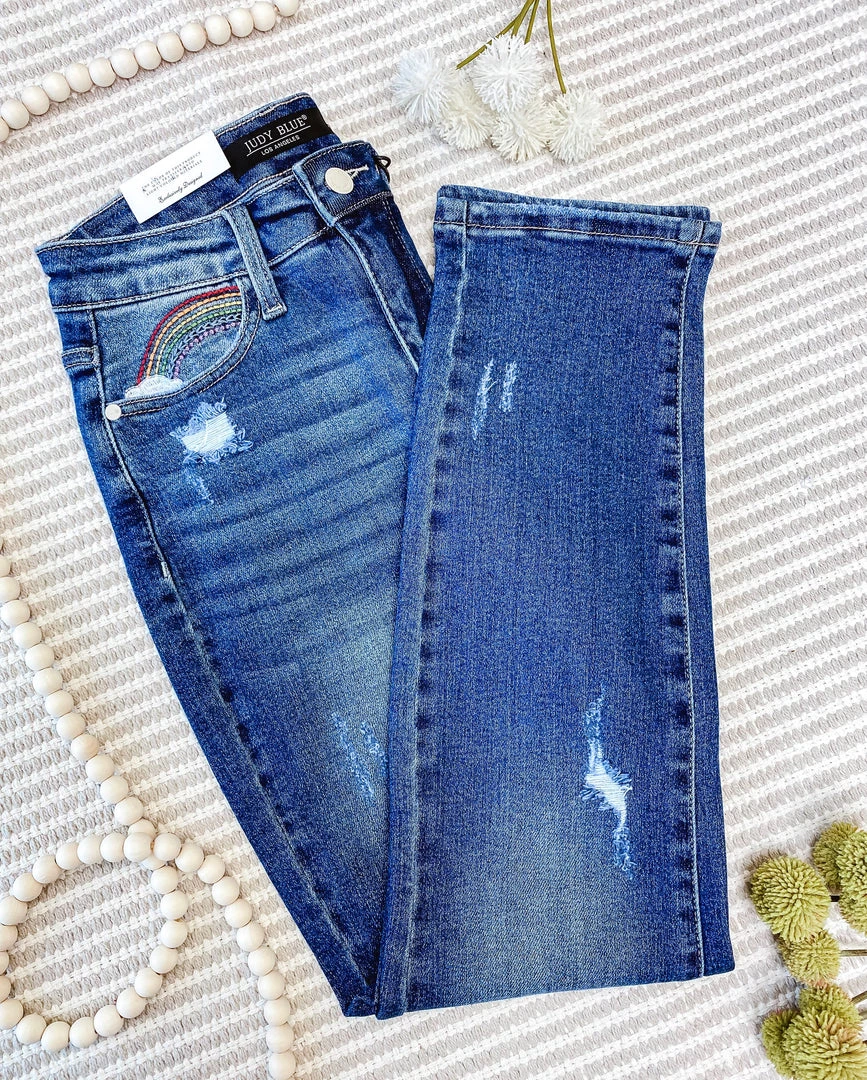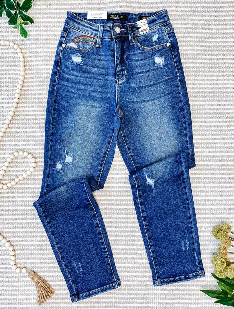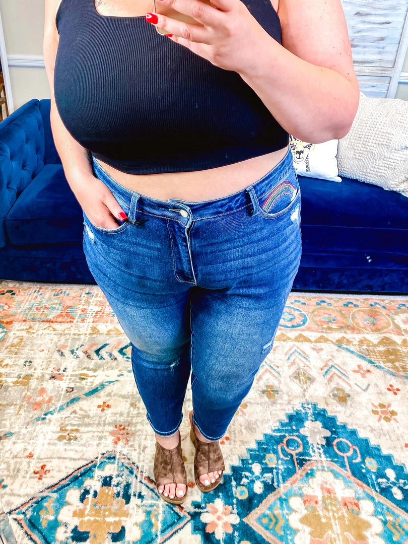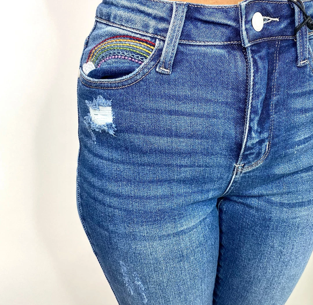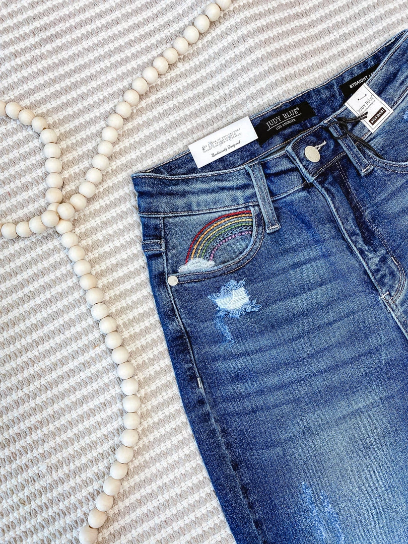 These high rise rainbow embroidery cropped straight Judy Blue Jeans are AMAZING!!! They have a medium wash!Β I bet you don’t have any jeans as beautiful as these ones, girl! These beauties add a lot of style and personality to any outfit! You’re gonna love them!!!