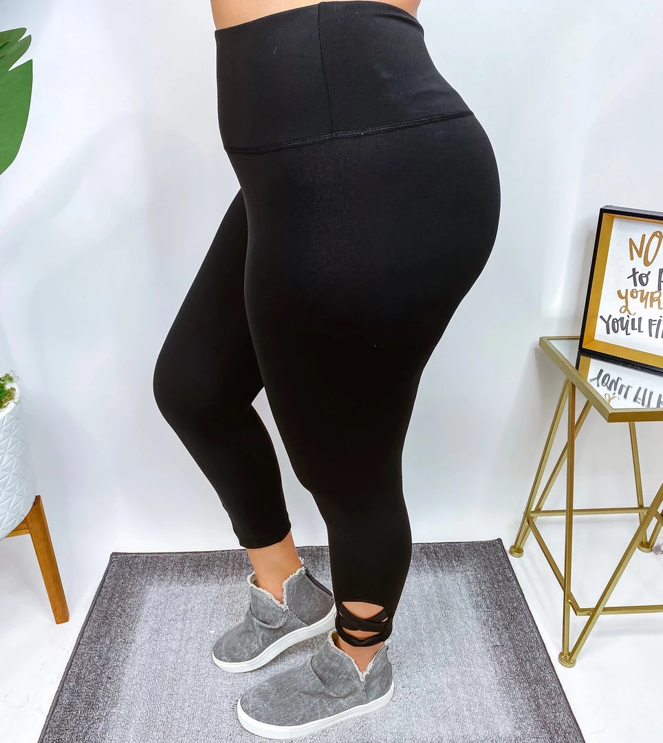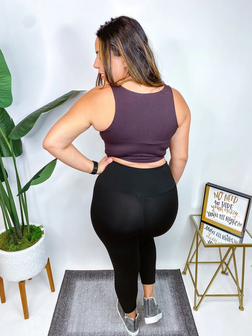 A high waisted solid knit legging with an ultra wide waistband featuring criss cross detail and a cropped length! Fabric is a lightweight athletic material! You’re gonna love be wearing this!