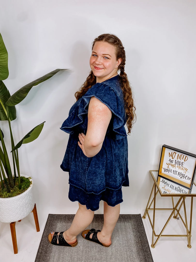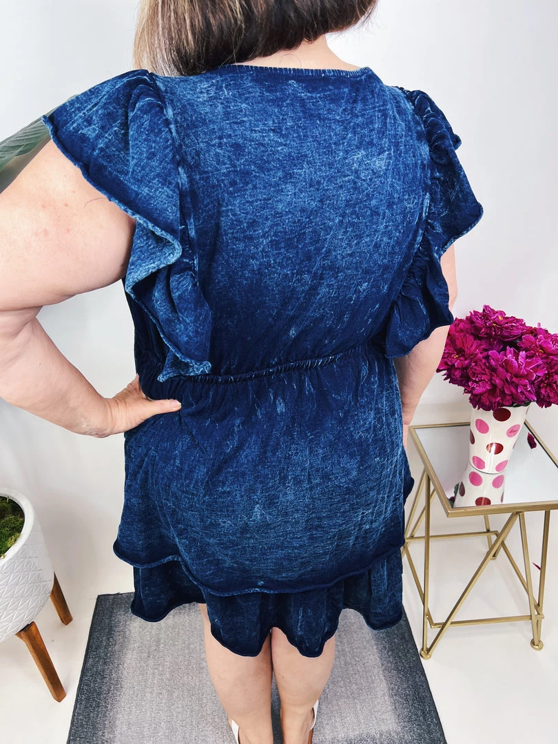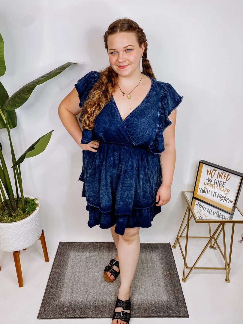 OMG! A short flutter sleeve solid knit dress with a surplice front featuring an elastic waist and a tiered body! Fabric is a lightweight mineral washed knit! You gonna get a lot of compliments with this!Β