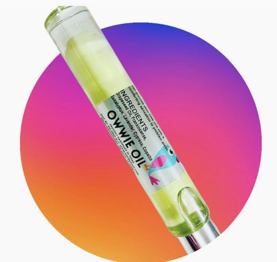 Owwie oilΒ –Β relieves your little one’s pain associated with muscle, nerve, joint, cramps, headaches, bruises, bites, burns, and more.Β Β Ingredients:Β Β grapeseed oil, eucalyptus, lavender, copaiba,Β cypress, frankincense how to use: apply a small amount directly to the pained area. For headaches or migraines apply to the temples and/or base of the neck