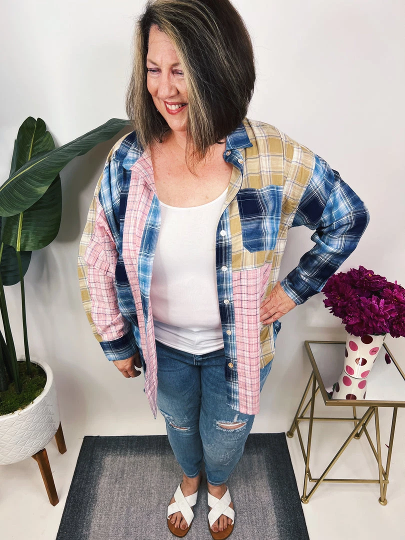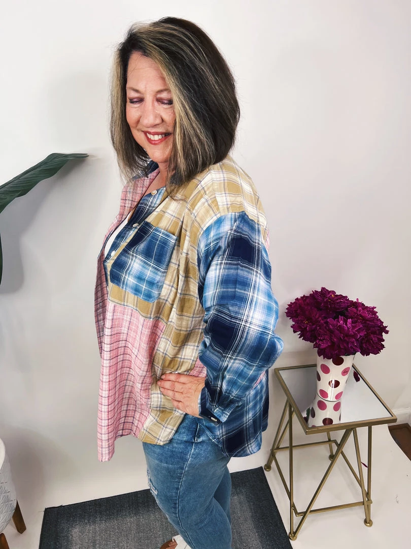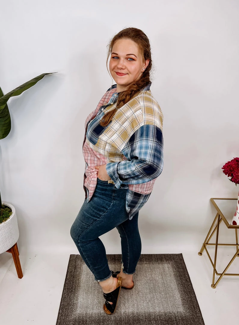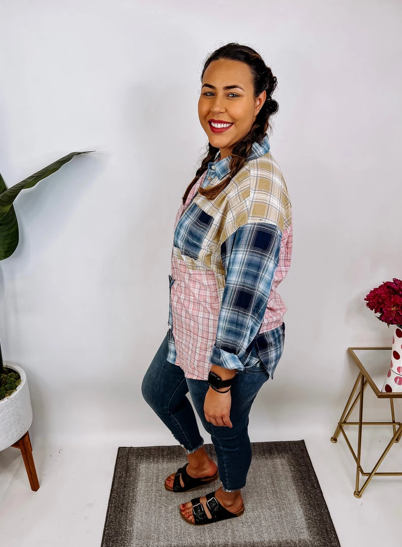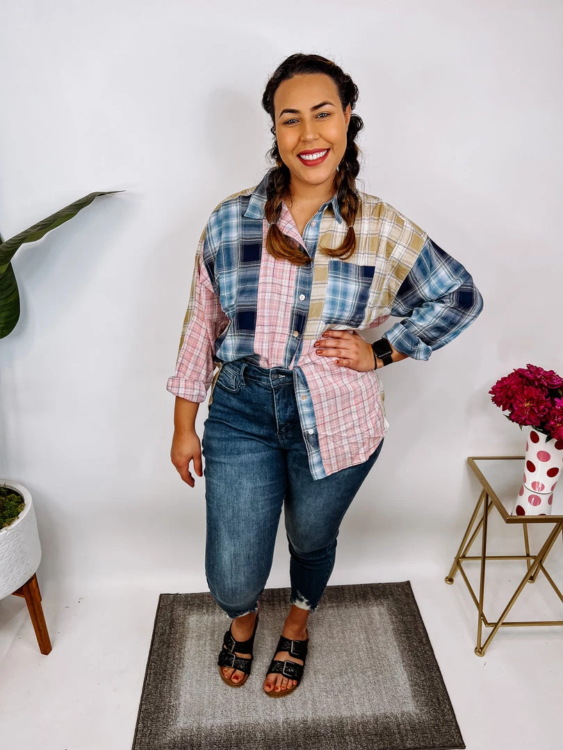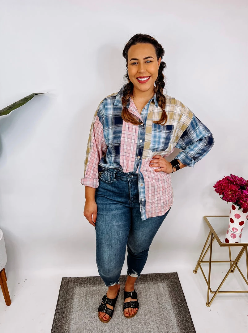 This flannel top is so beautiful, girl! You’re gonna love it! We’re obsessed with it! This button down , long sleeve top features a front blue pocket and a gorgeous patch work.Β The fabric in this top is so delightful and sophisticated! It’s really lightweight. Get ready to fall l in love with it!