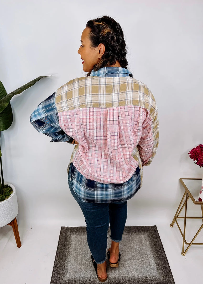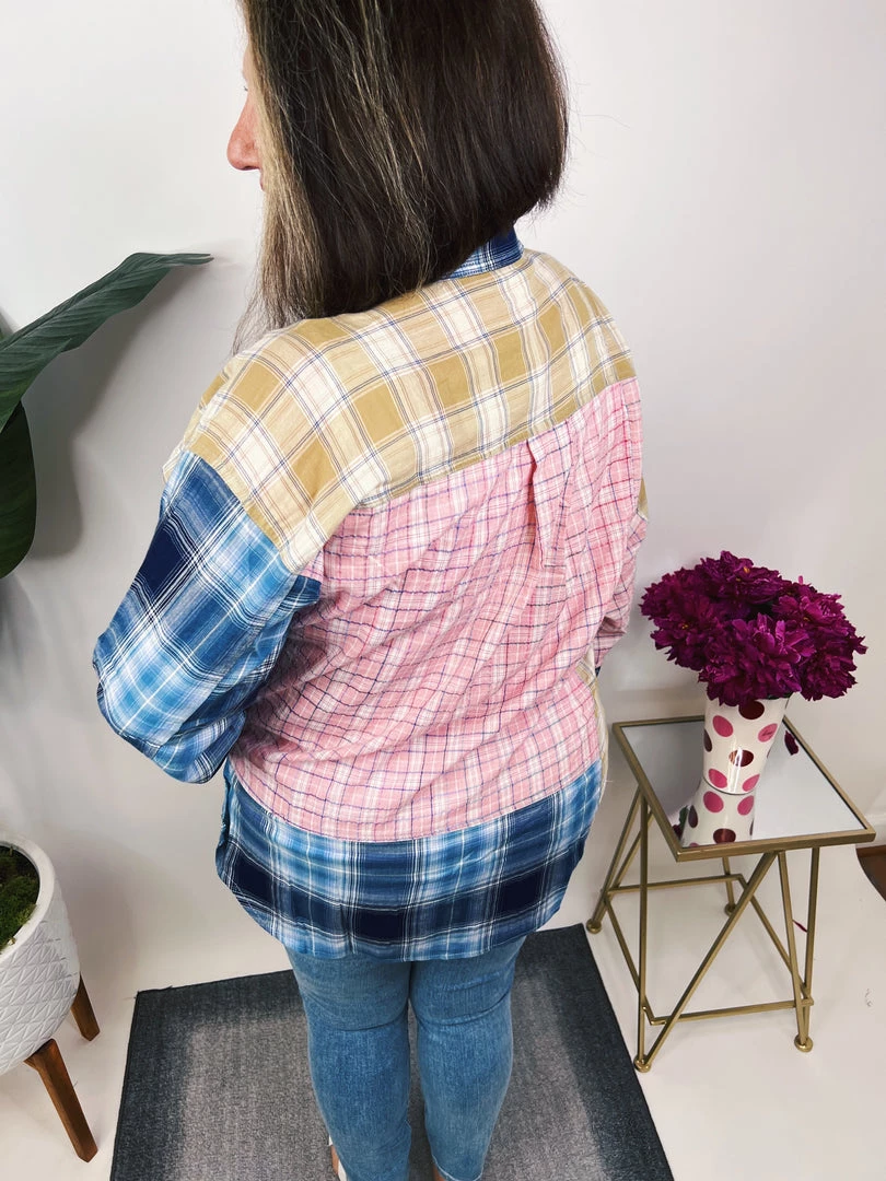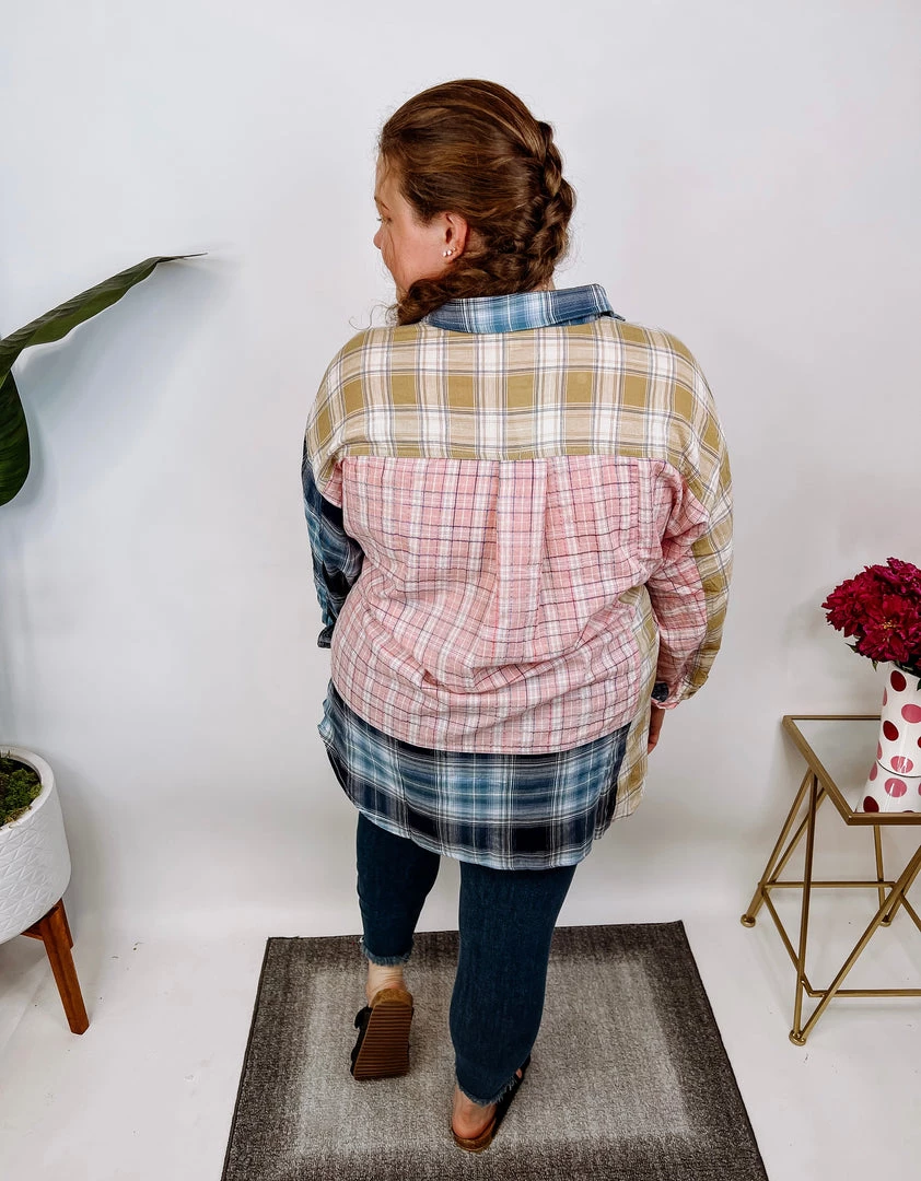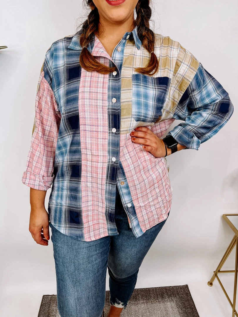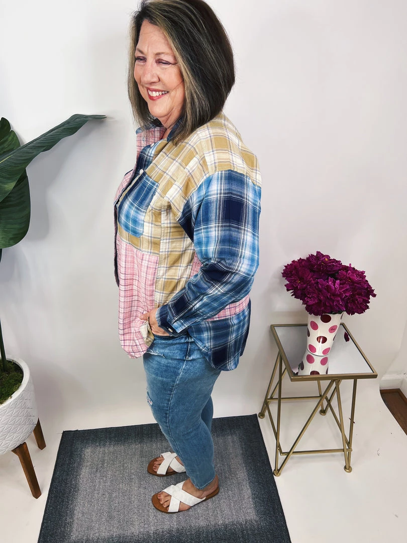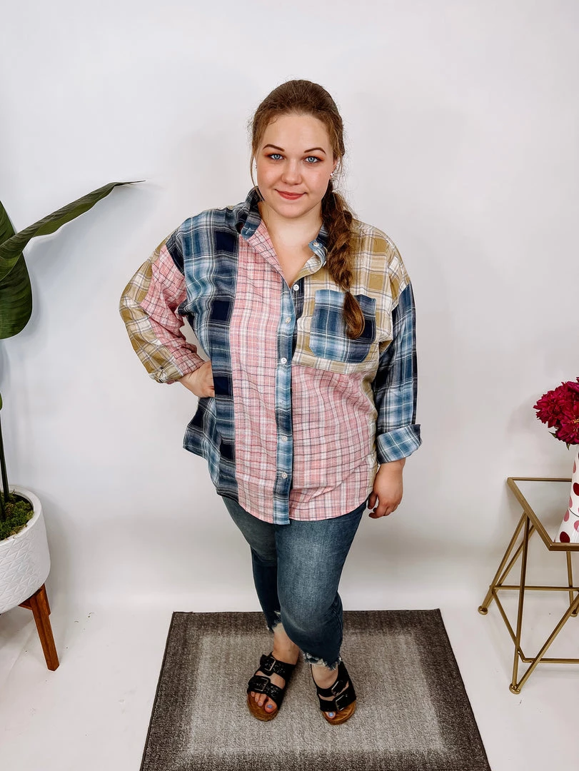 This flannel top is so beautiful, girl! You’re gonna love it! We’re obsessed with it! This button down , long sleeve top features a front blue pocket and a gorgeous patch work.Β The fabric in this top is so delightful and sophisticated! It’s really lightweight. Get ready to fall l in love with it!