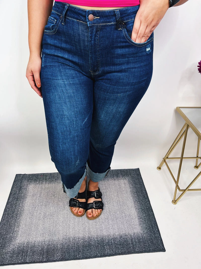 Oh my Gosh! These Mid Rise Straight Cuffed Jeans are AWESOME! They are dark wash with whiskers and light sand-washing, some distressed look on top, near the pockets. They also have an amazing stretch!!Β Snag your pair ASAP! If you are looking for a comfortable pair of jeans, these are the ones for you!