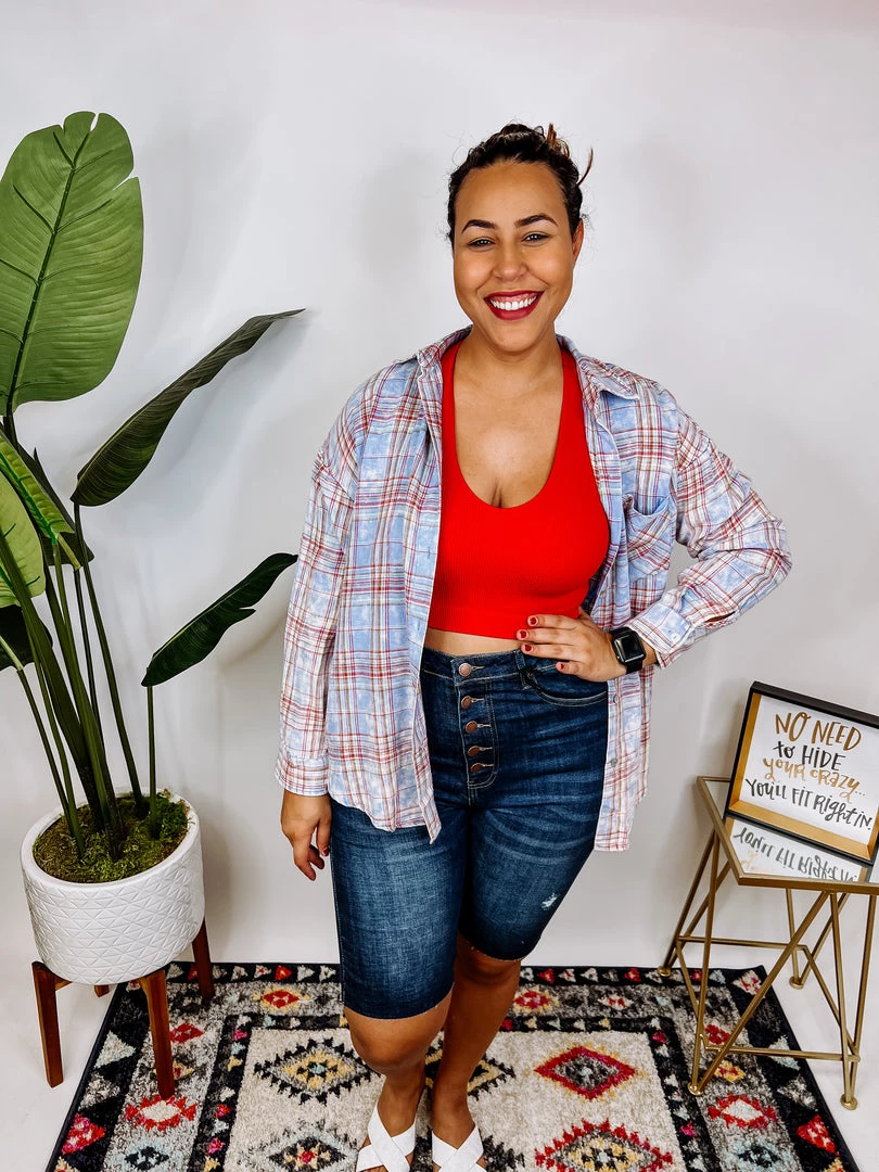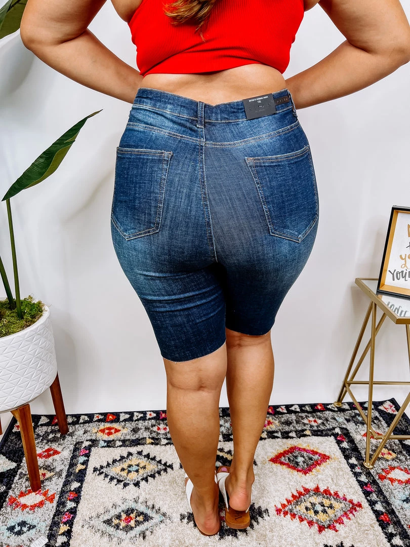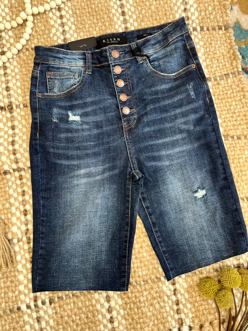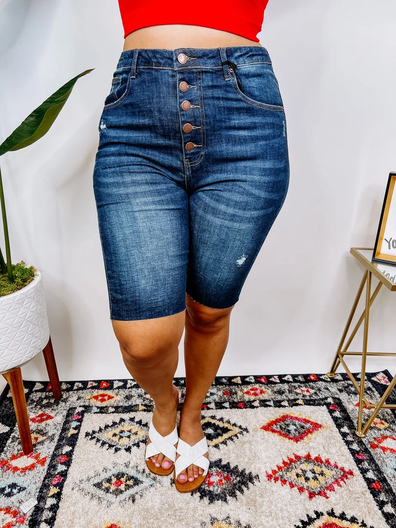 These amazingΒ high waist button fly shorts feature light distressing and dark wash that is absolutely stunning and a raw hem!Β The material is so soft and comfortable!! Pair these gorgeous shorts with your favorite top and have the perfect outfit for summer!