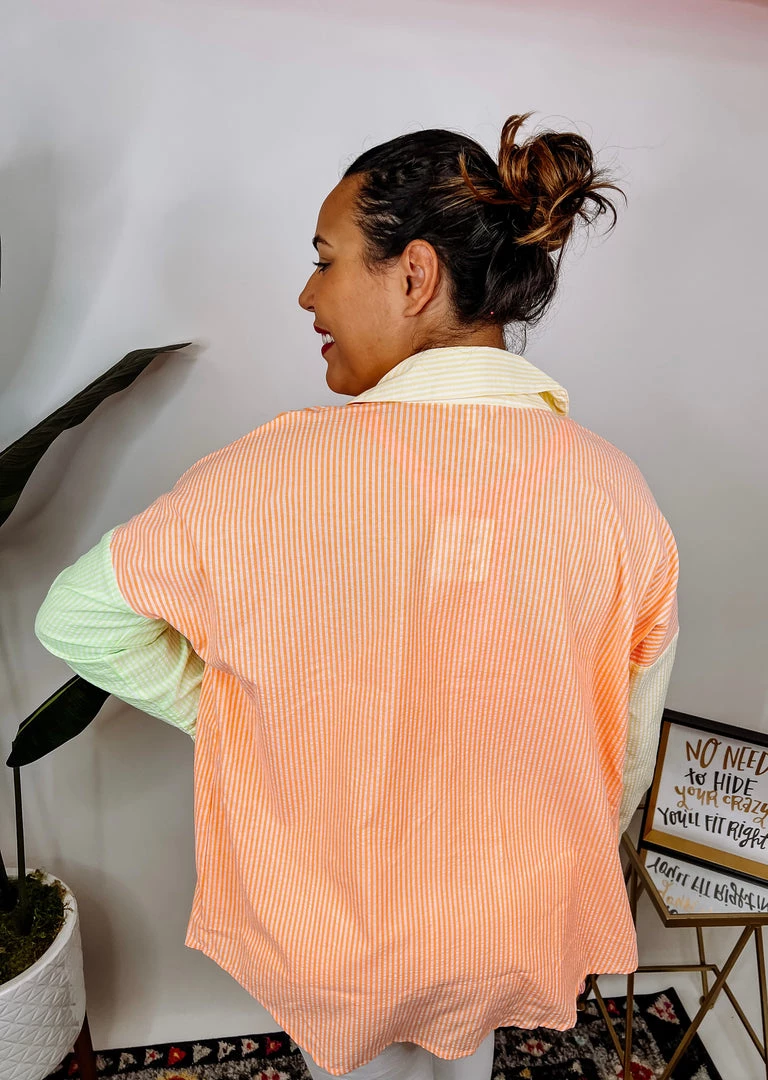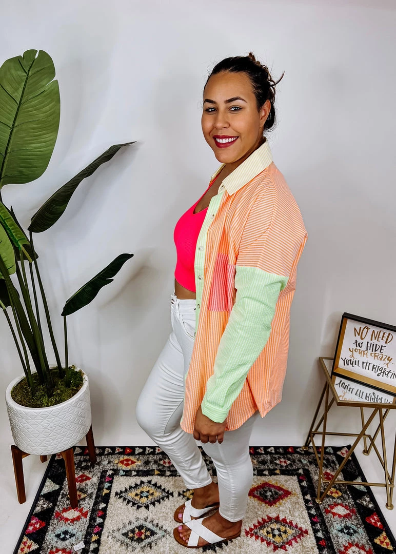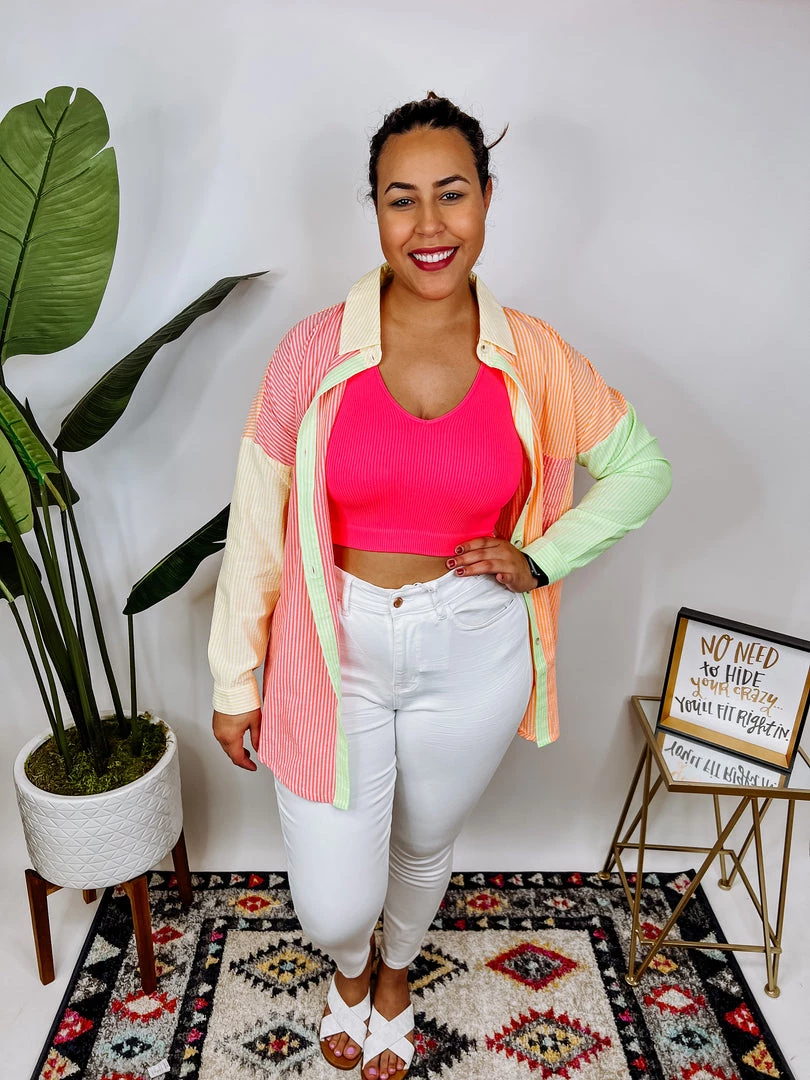Wow!! An amazing neon button down shirt with vertical stripes in orange, yellow, pink and green bright colors!! It features a front pocket and its a lightweight piece. It matches perfect with our JB jeans and JB shorts!! A lot of style for your summer!!