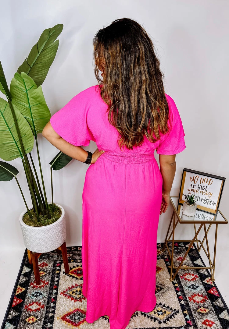 WE’RE OBESSEDED with this dress! It’s a short sleeve, maxi dress with an imperial waist, v-neck front snap, tie back and a BEAUTIFUL hot pink. You can literally wear this any occasions, to a picnic or to a date night. Get one and thank us later.