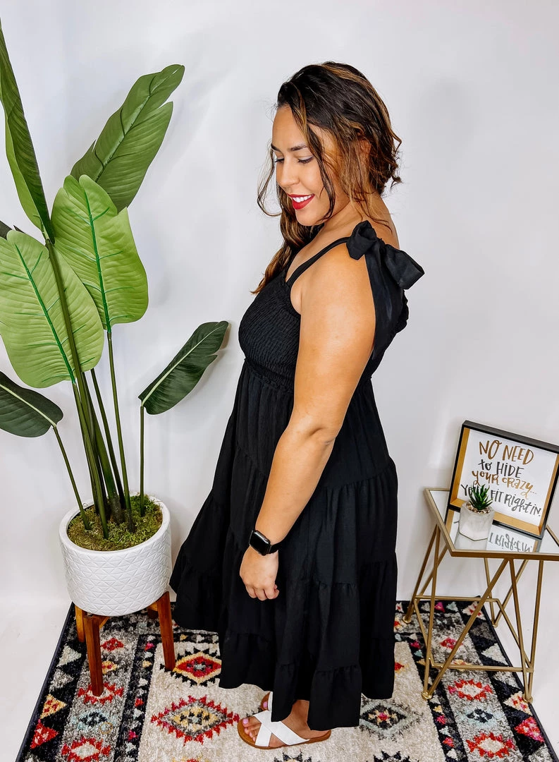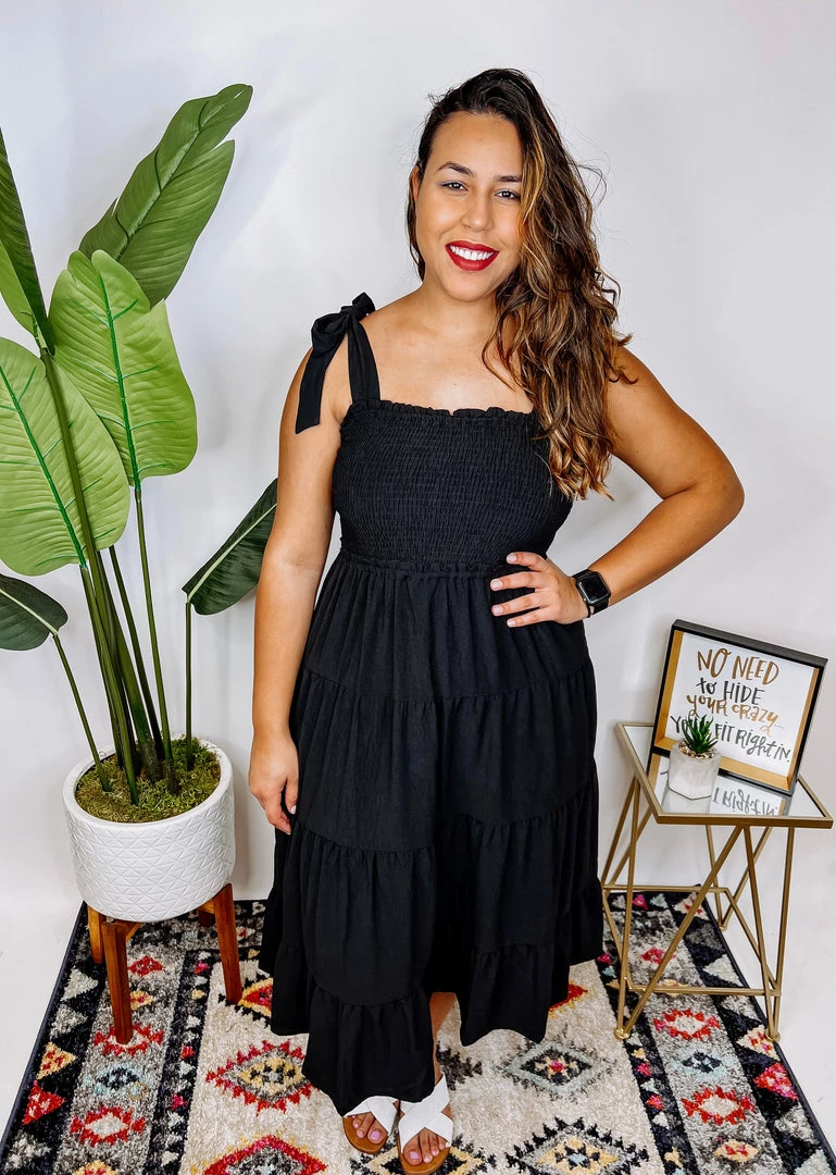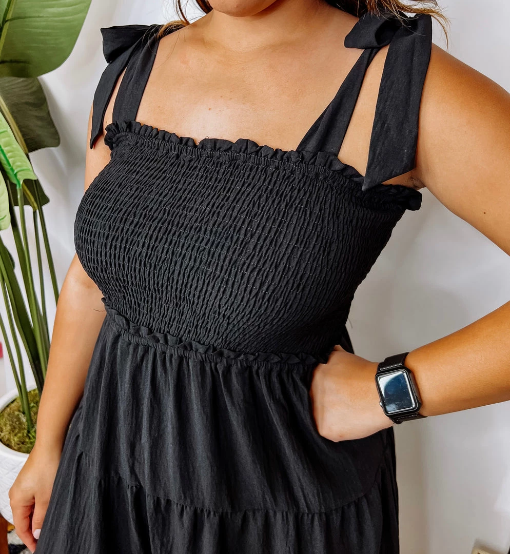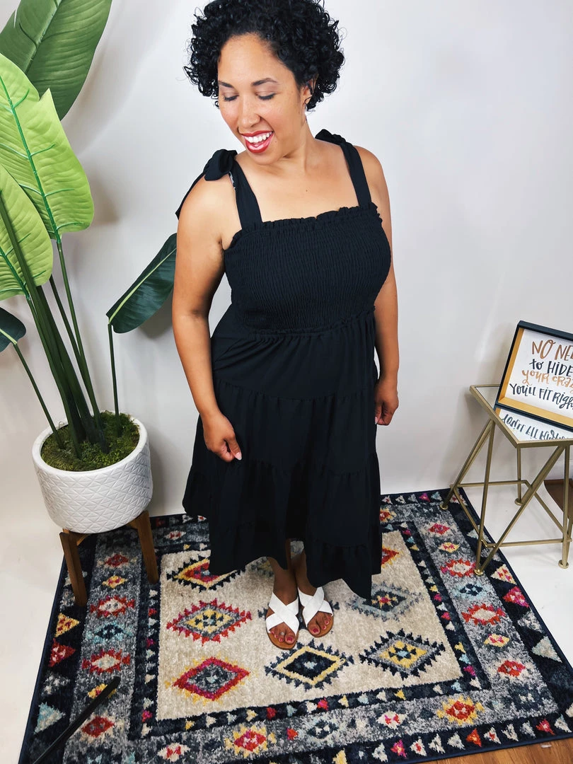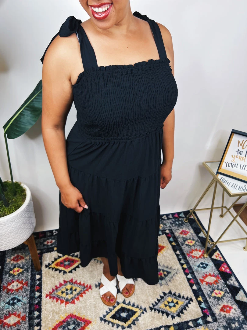 This solid shoulder tie point tiered midi dress featuring a square neckline, smocked bodice, tied shoulder straps and sleeveless is SO beautiful! It’s a very flattering piece that is also super comfortable! You’re gonna love it!