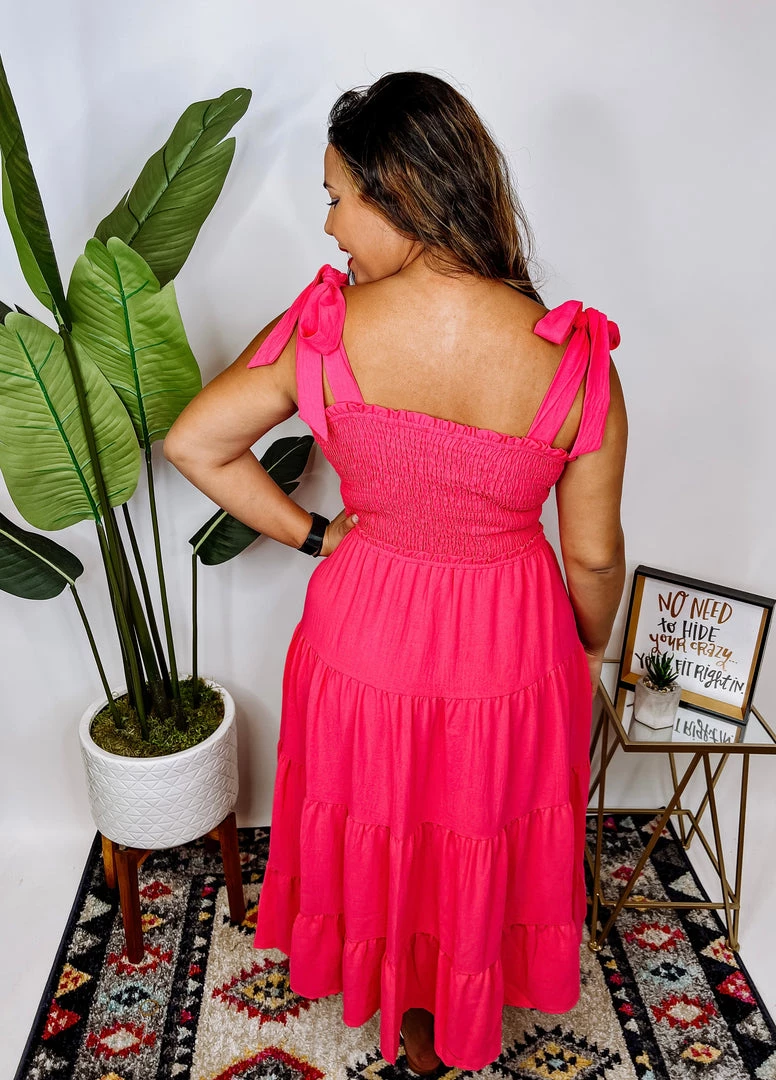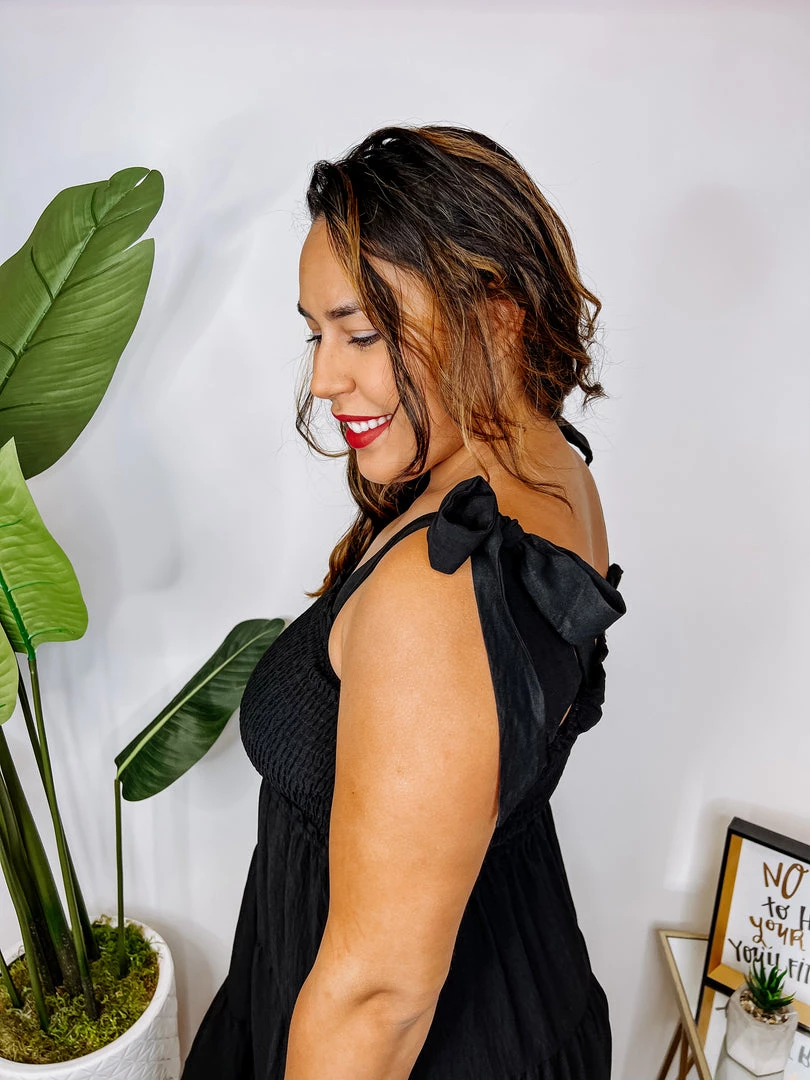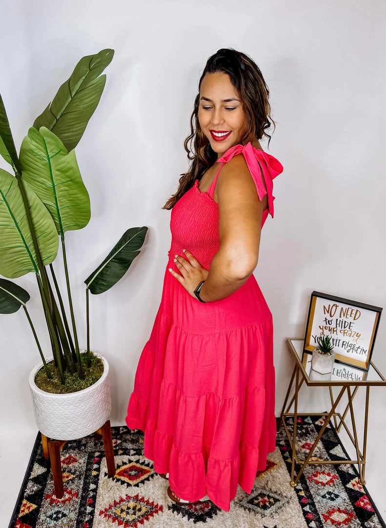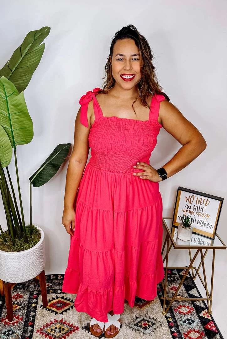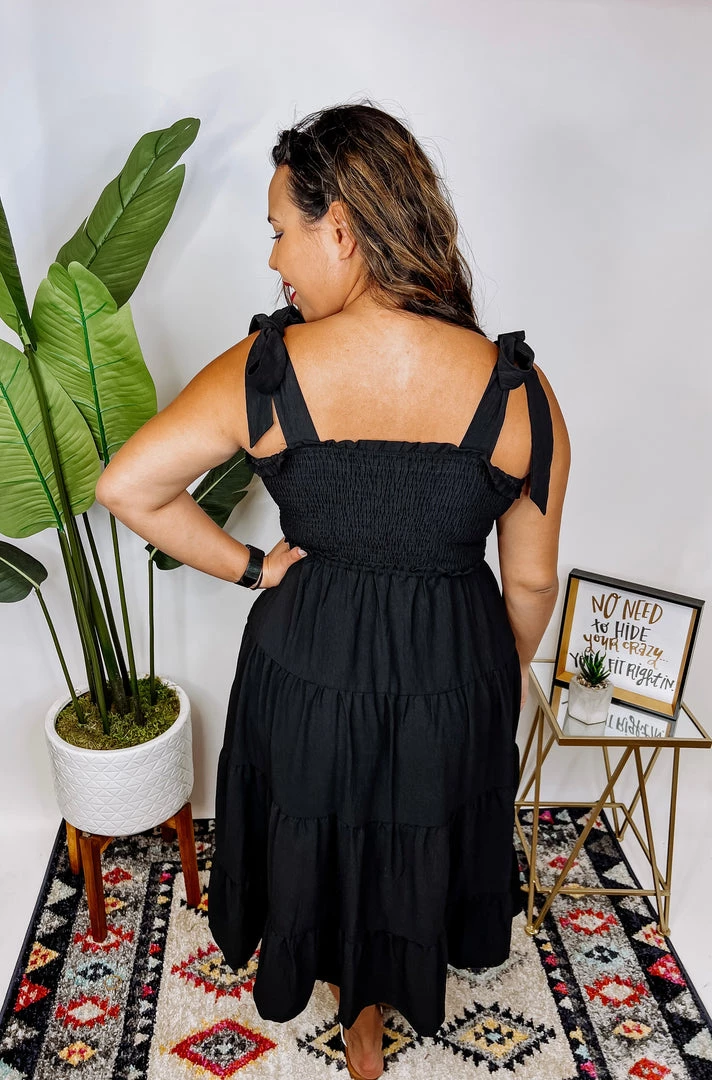 This solid shoulder tie point tiered midi dress featuring a square neckline, smocked bodice, tied shoulder straps and sleeveless is SO beautiful! It’s a very flattering piece that is also super comfortable! You’re gonna love it!