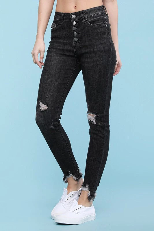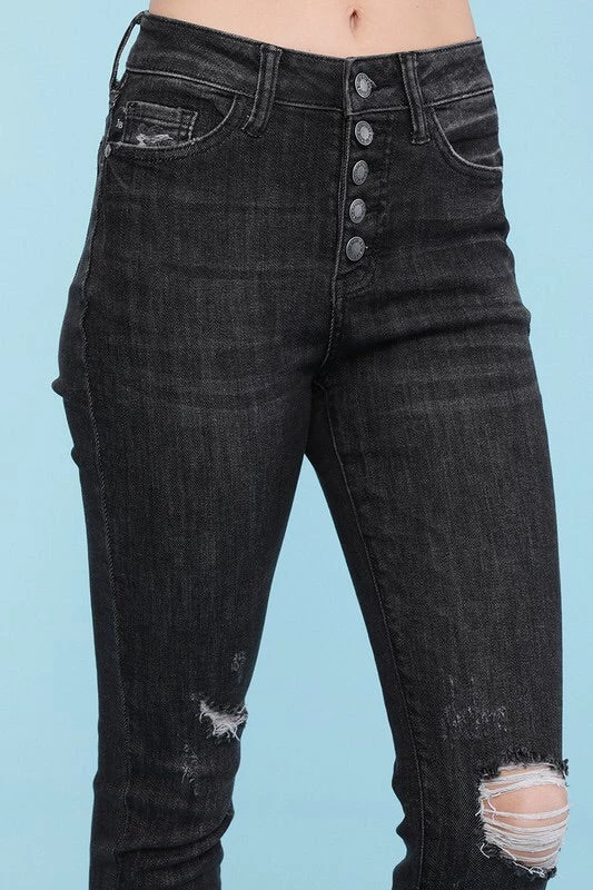 These amazing high waisted grey distressed Judy Blue button fly jeans feature distressing on the knees and the cuff! These jeans are perfect for a casual day out!