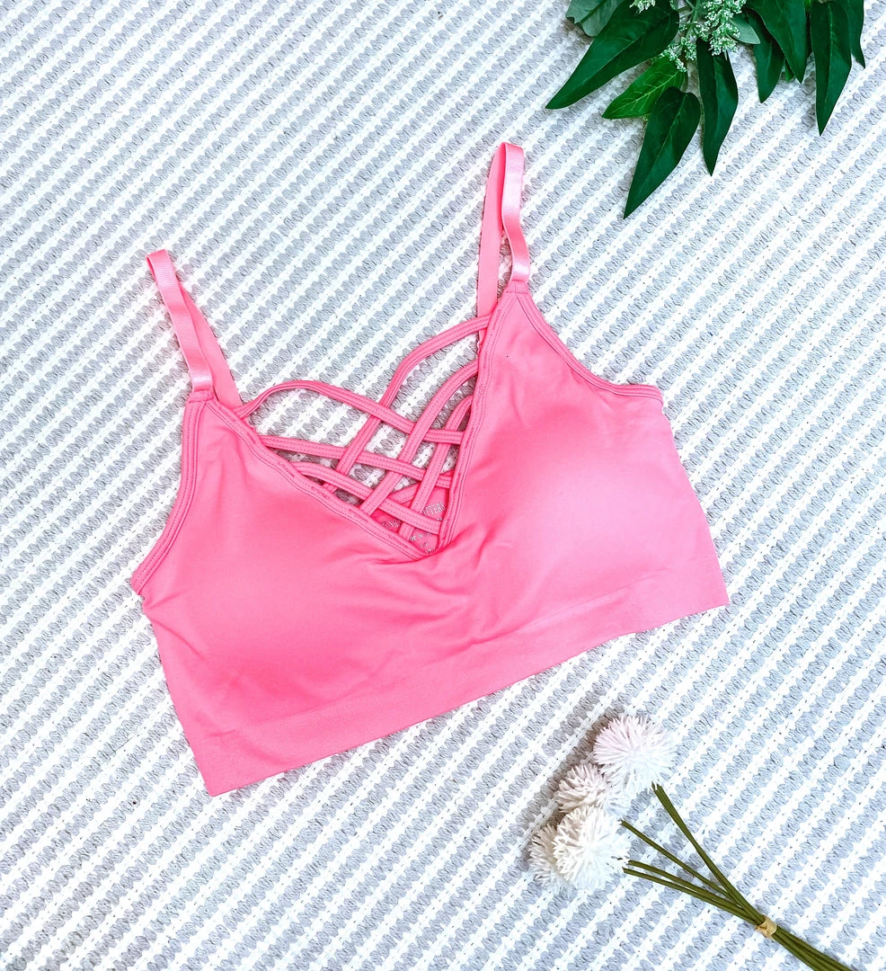FRONT V-LATTICE, ADJUSTABLE STRAPS BRALETTE WITH REMOVABLE BRA PADS