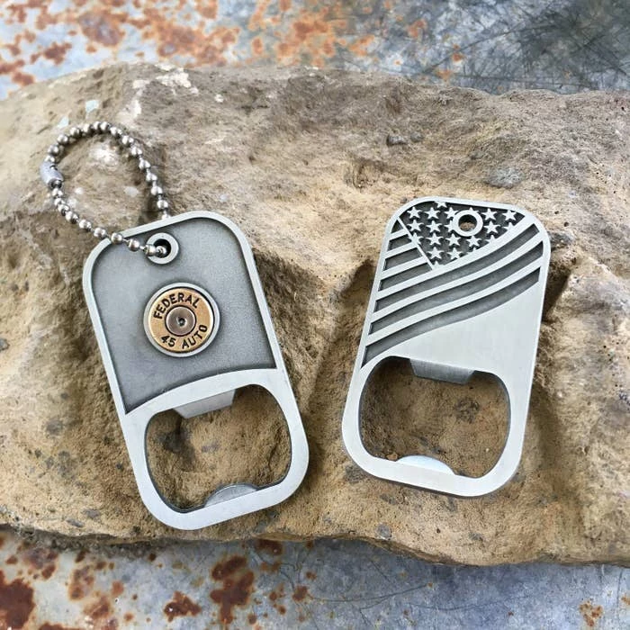 On the front side of this solid key chain, you’ll find an American Flag with deep stripes and on the reverse, we have completed the design with a .40 caliber, recycled from a Police Officer’s spent bullet casing.