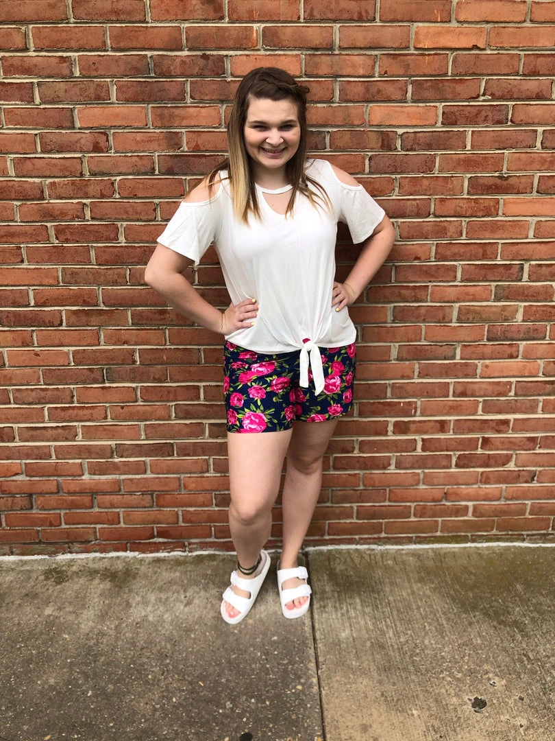 95% RAYON 5% SPANDEXSHORT SLEEVE COLD SHOULDER KEYHOLE NECK SOLID TOP WITH TIE DETAILMADE IN USAΒ