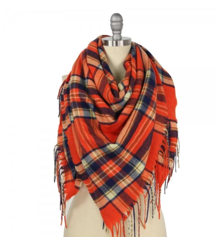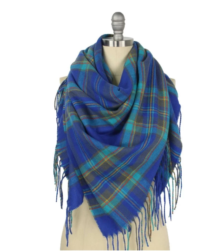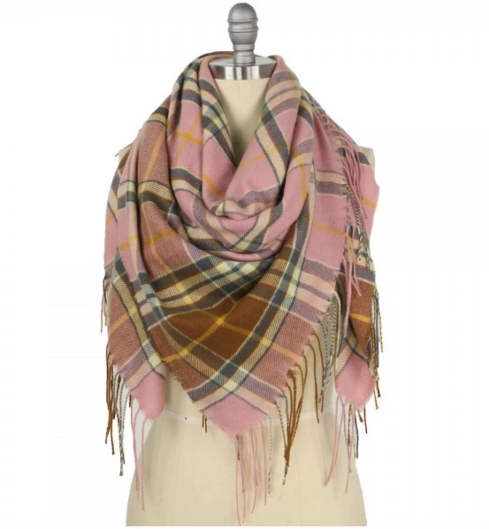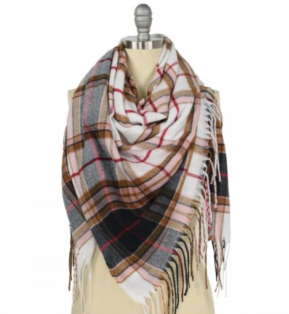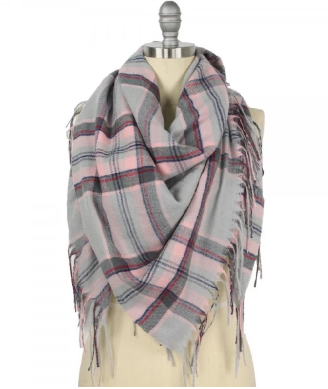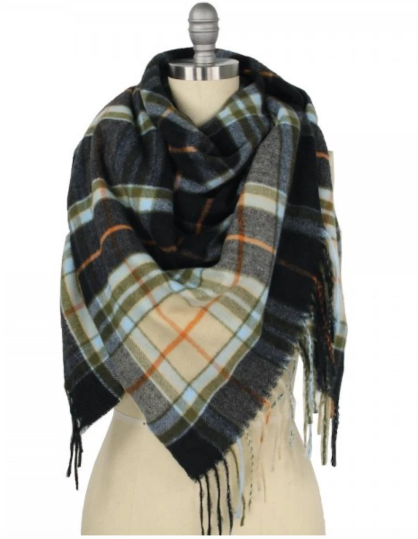 Plaid Bordered Square Blanket Scarf Featuring Fringe Trim.