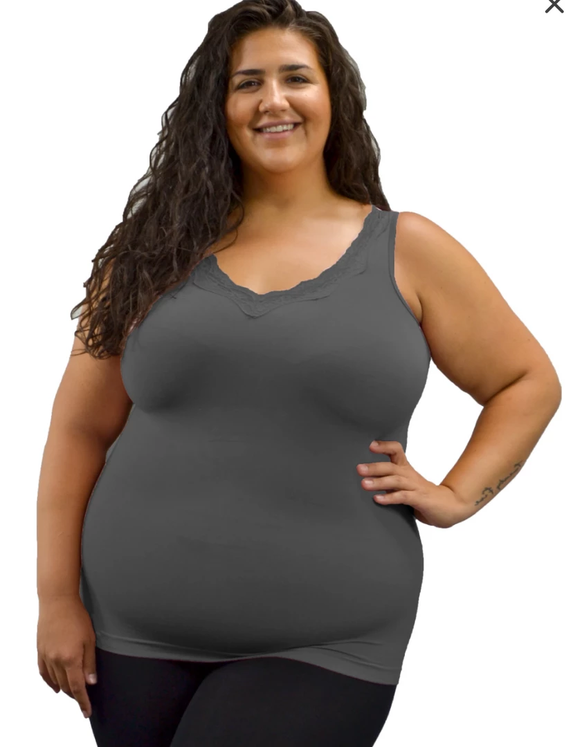 This beautiful stretchy reversible tank has a lace lined v-neck. This tank can be layered or worn as is!Β
