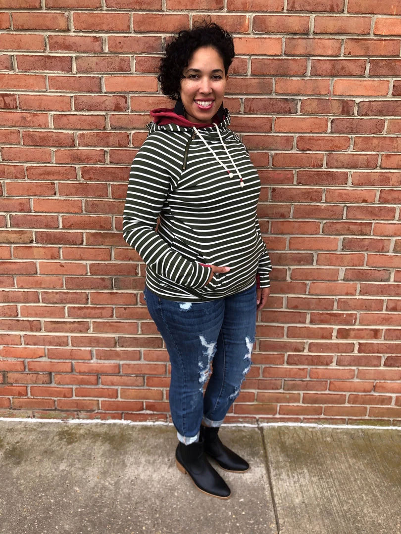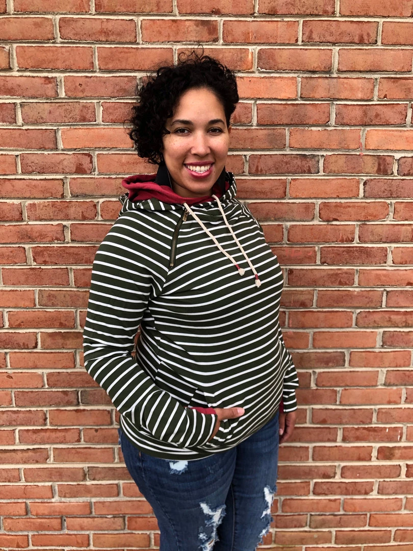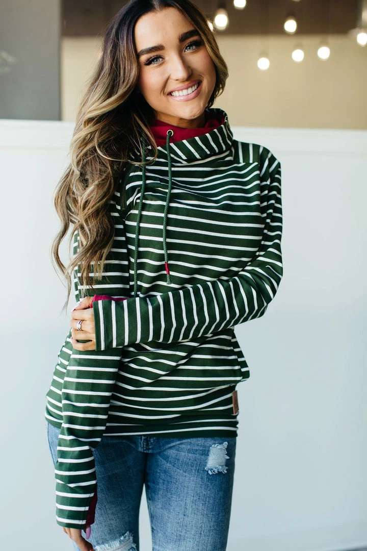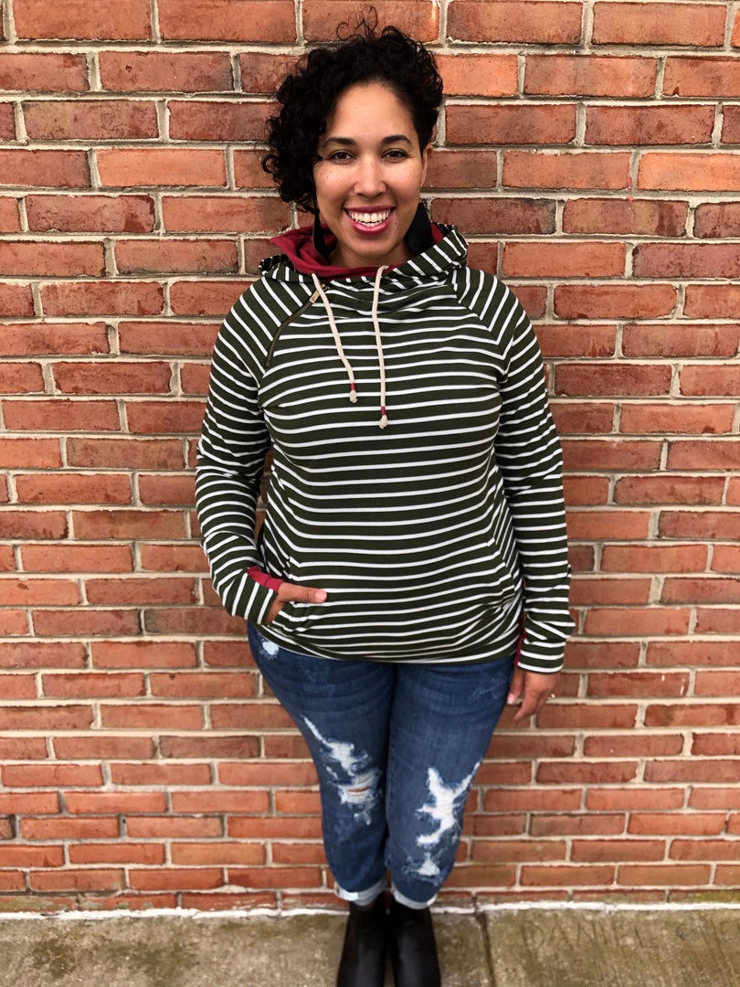 This original Ampersand double hooded sweatshirt is so beautiful! With its green and white stripe body and red accents, this hoodie is amazing!