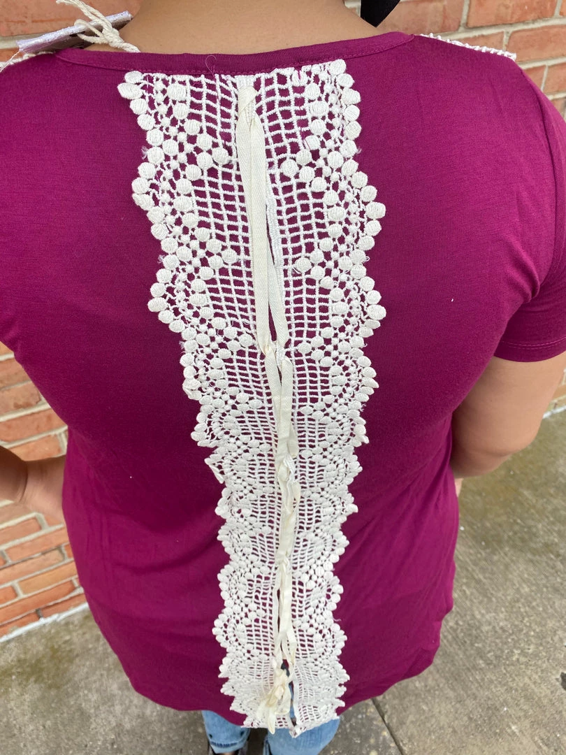 This beautiful top looks so simple from the front, but the back adds so much character- you will love showing this off! The lace at the back adds a flattering and sexy look to this super soft top!