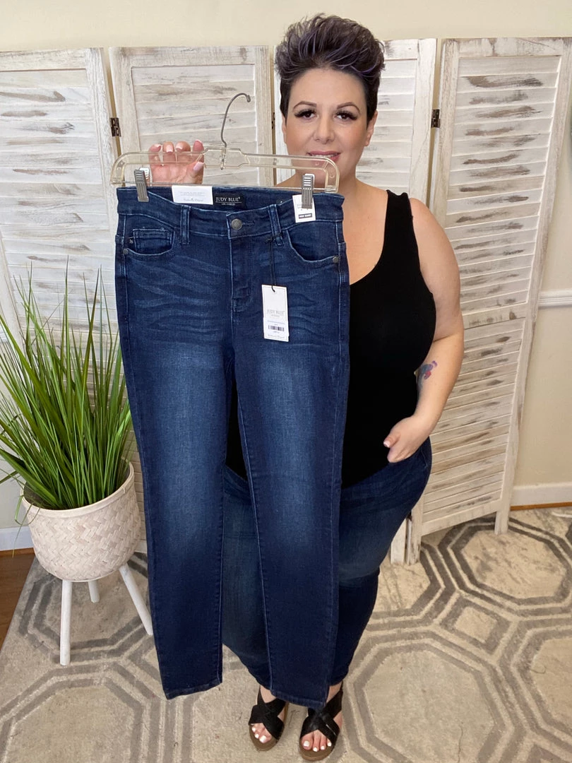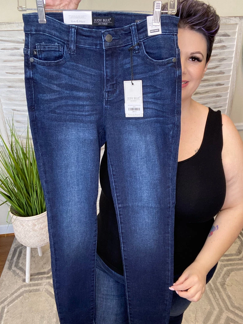 These classic high waisted, non-distressed skinny fit Judy Blue jeans are perfect for any occasion. These dark blue jeans can be dressed upΒ or dressed down and will keep you comfortable all day and night with their amazing stretch!Β