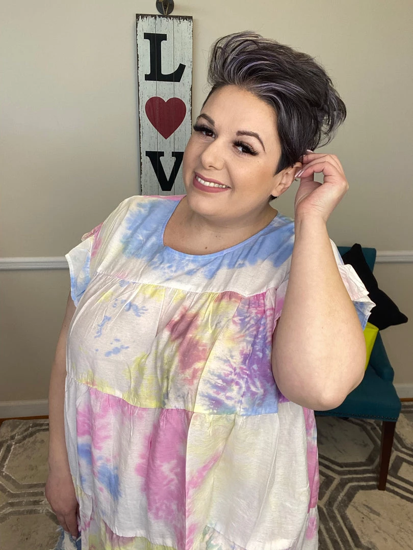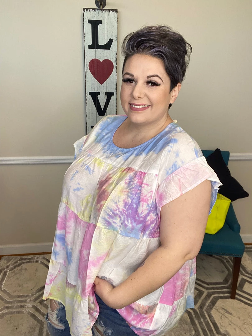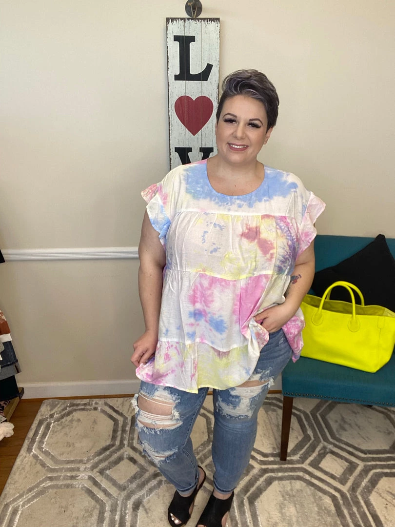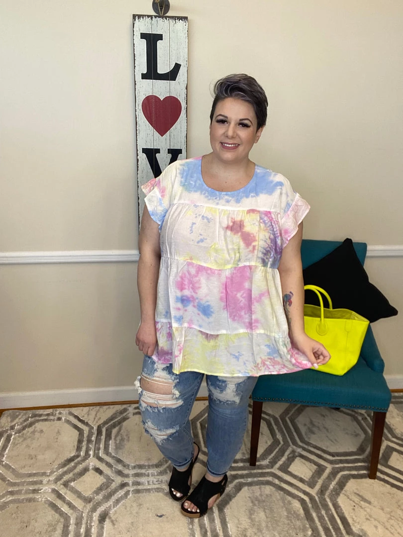 This adorable blouse features a teared babydoll style with ruffled cap sleeves and a keyhole button in the back! Pair this top with your favorite bottoms to have a super cute, comfortable outfit that is perfect for going out or lounging around in!