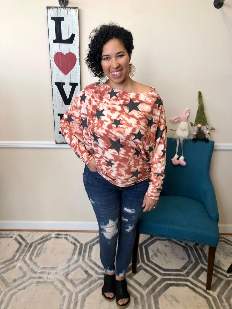 This star dolman with a fire red tie dye background will fire up any day! Set your outfit aflame with this gorgeousย asymmetrical hem top withย stars on it and smoke everyone else!