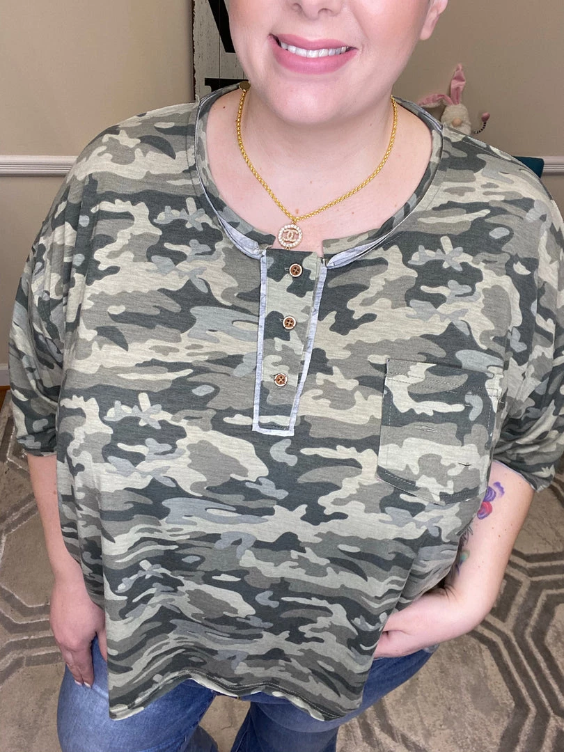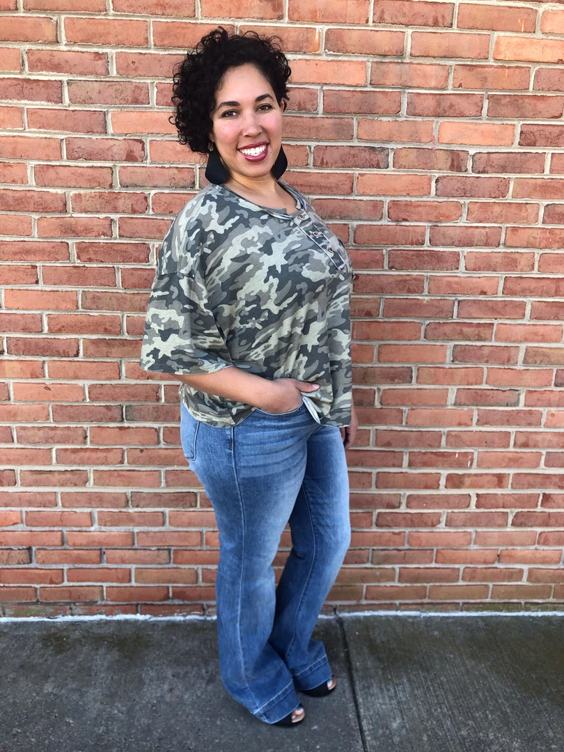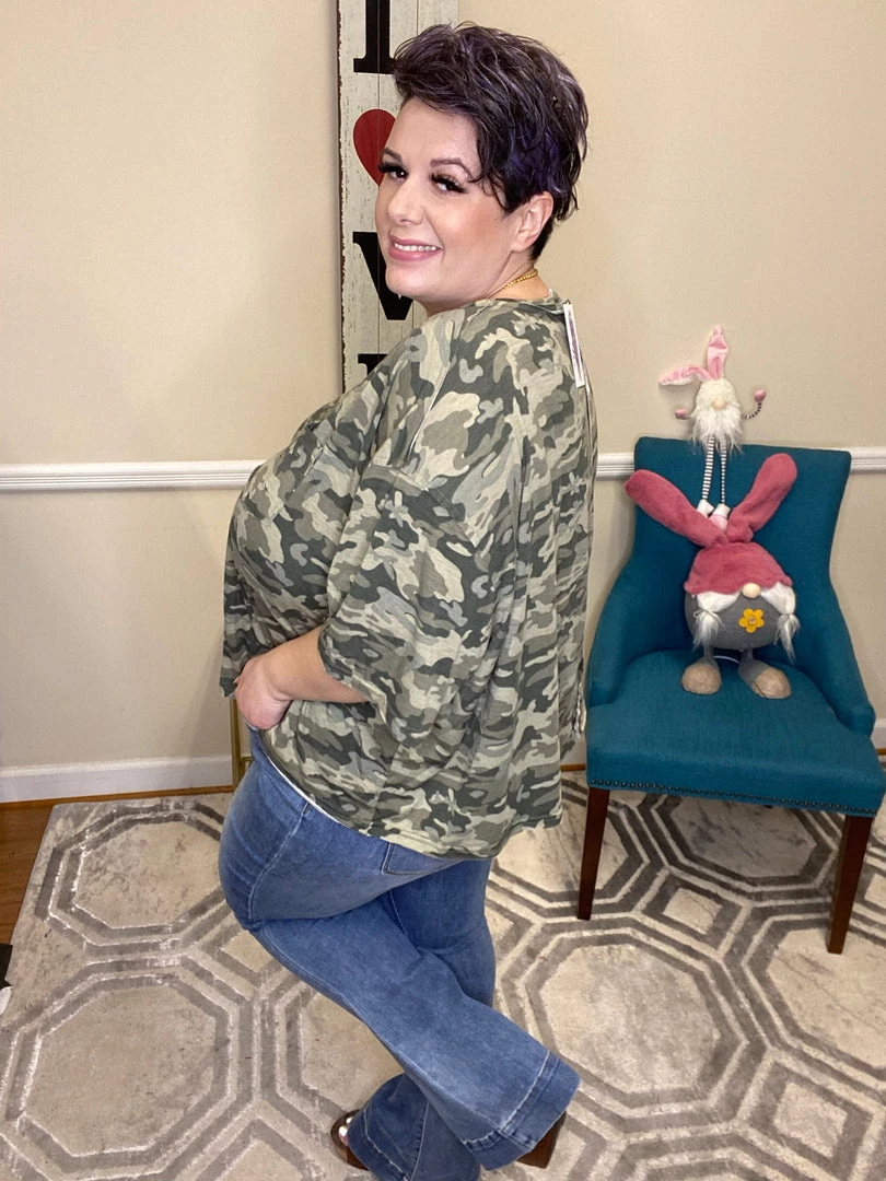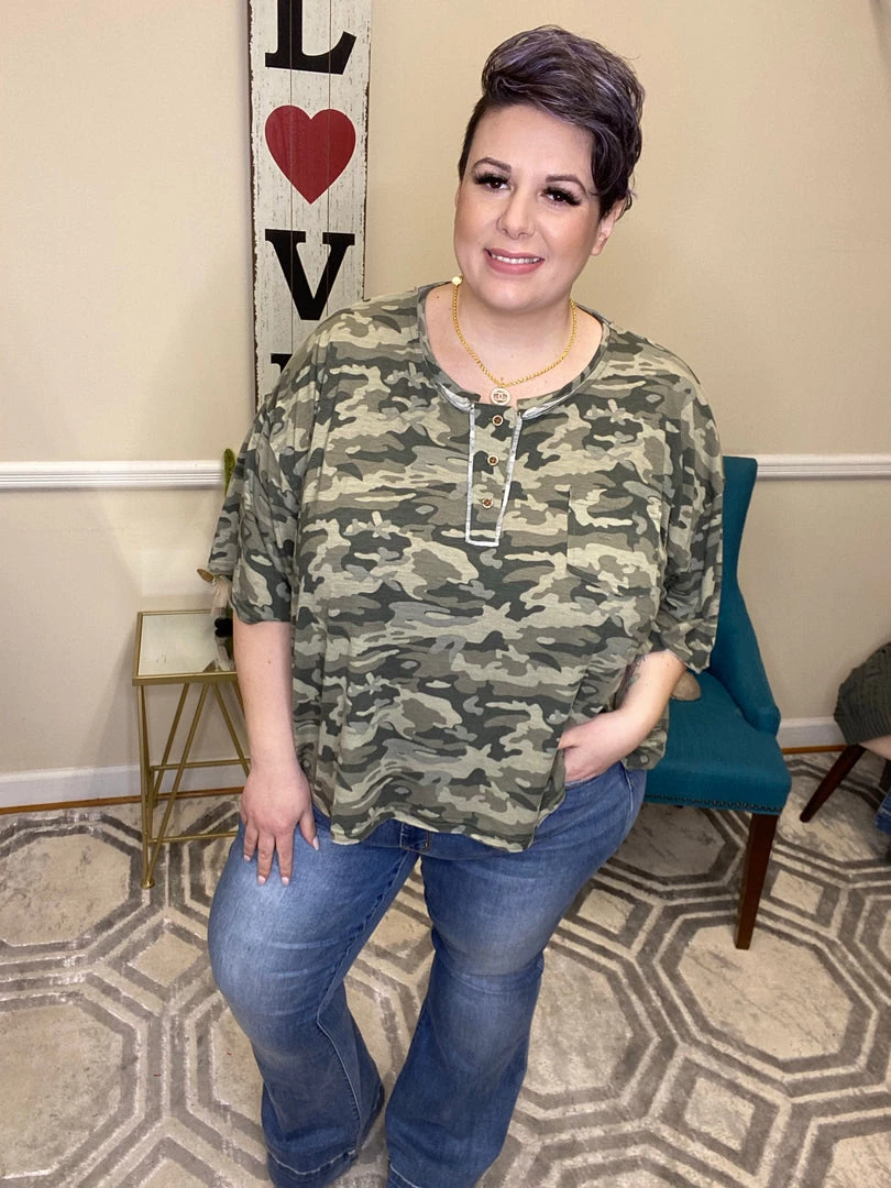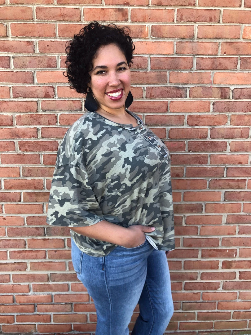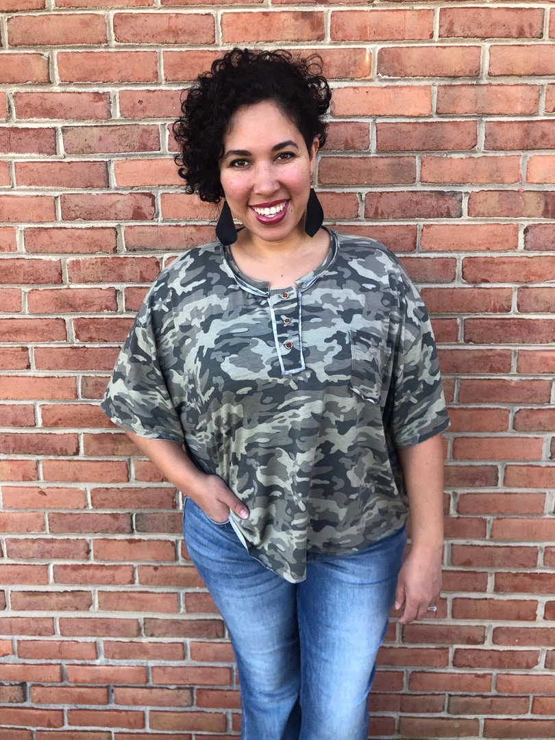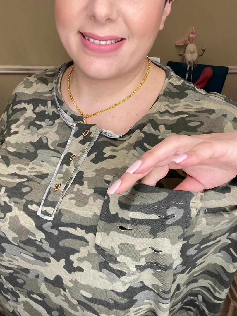 This gorgeous camouflage POL top is so soft and has a relaxed fit. The raw edging and buttons make this a simple, elegant and casual top that can easily be paired with your favorite bottoms to lounge in or for a day out on the town in!