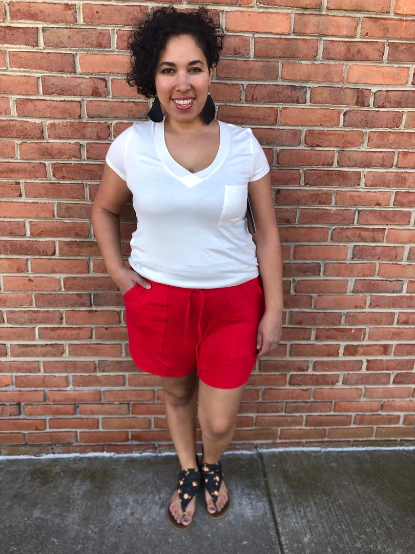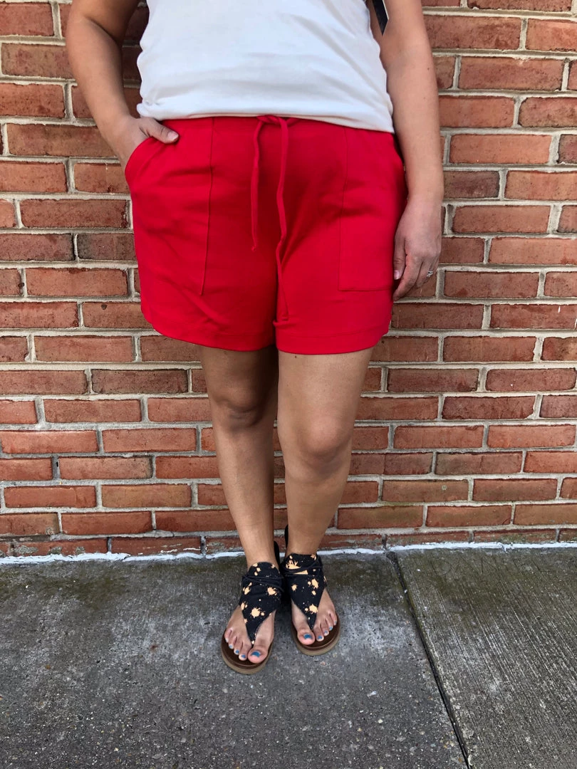 Solid knit shorts featuring an elastic waist with drawstrings and pockets. Content: 100% Cotton