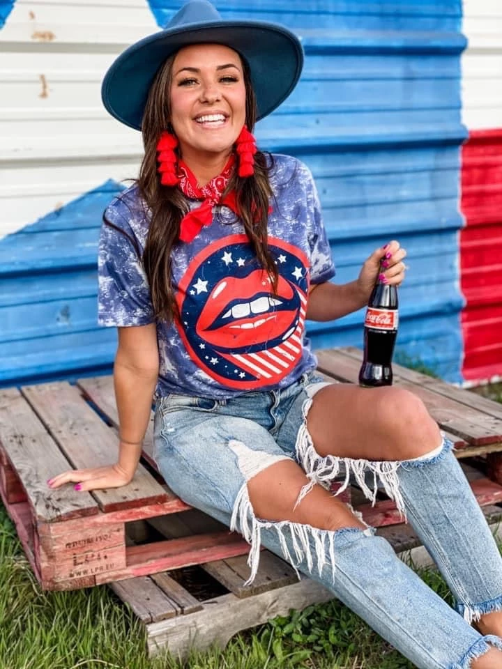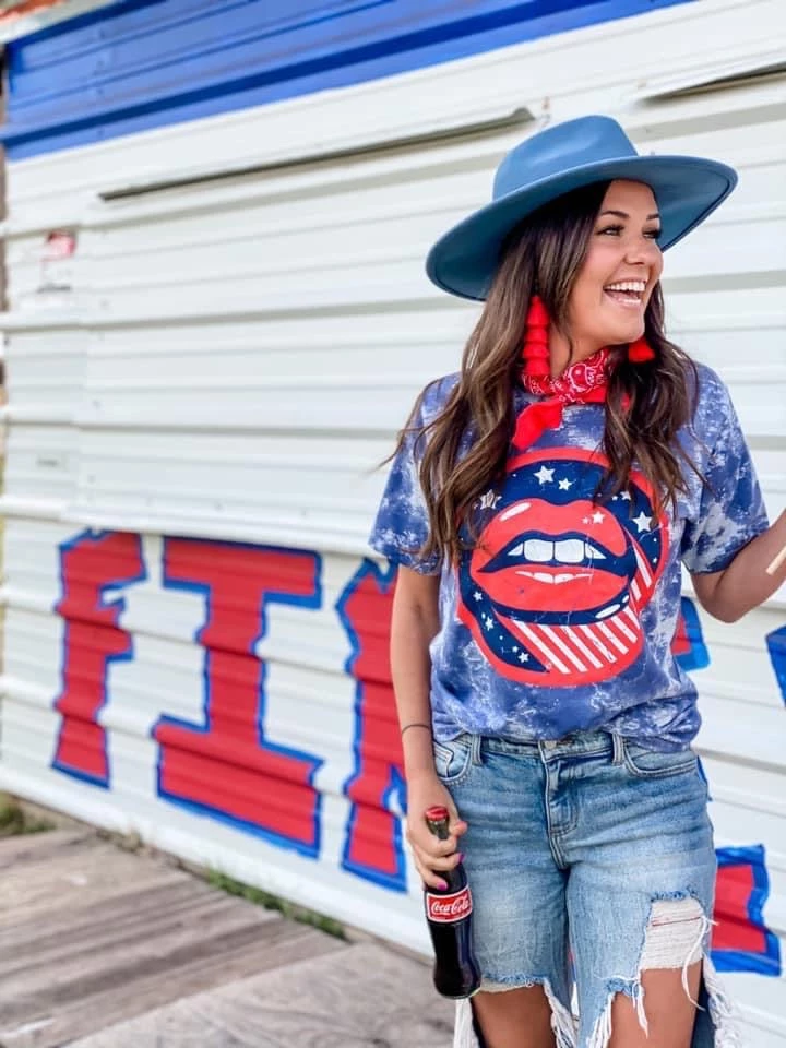 This gorgeous tee is a tie dye blue with a red, white, and blue lips, stripes and stars on it! You will love pairing this super soft tee with your favorite bottoms for a cute and casual look!Β