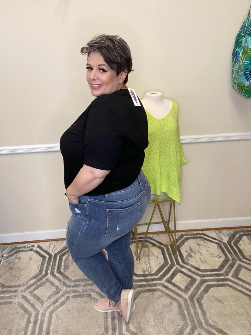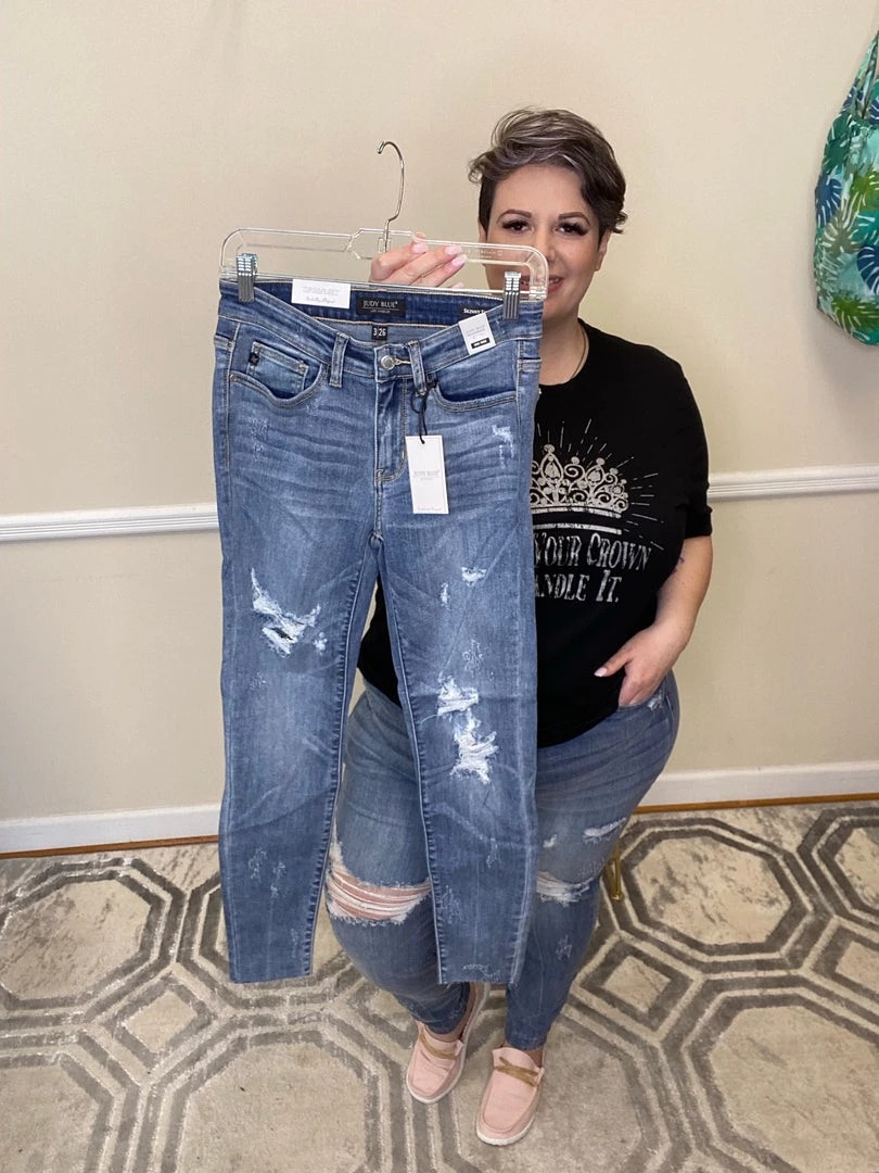 These beautiful Judy Blue jeans with light distressing features a raw cut hem and are mid rise! The medium wash color gives it a bright feel that is sure to brighten any outfit you pair them with!