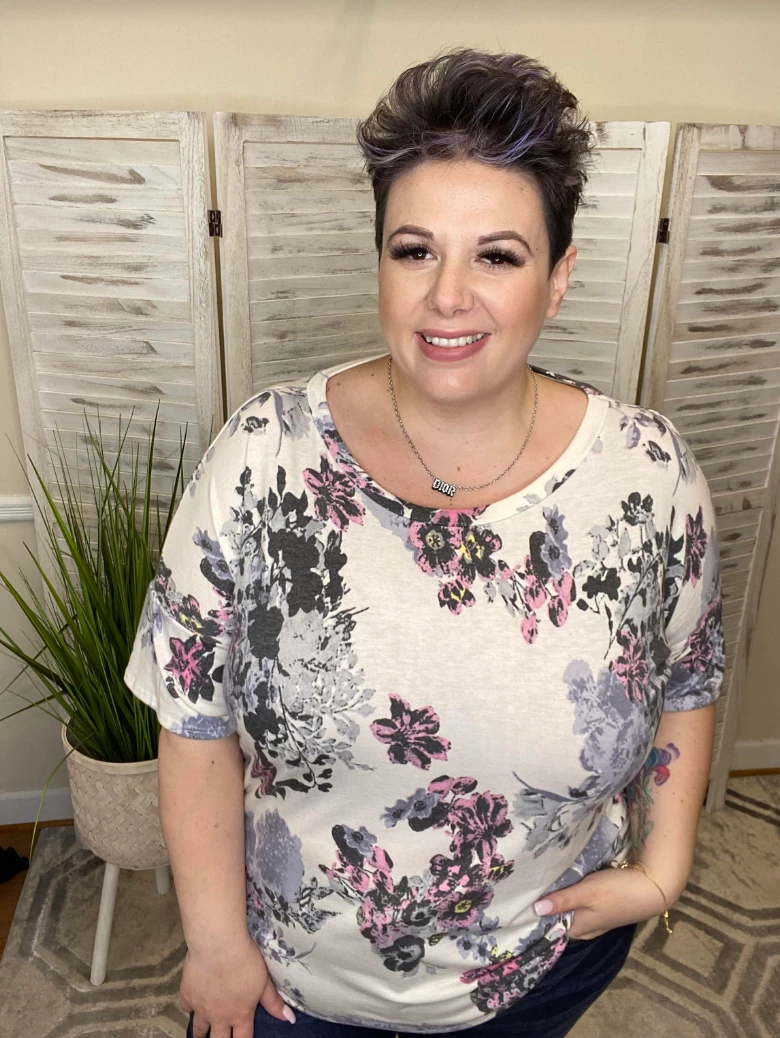 This gorgeous top features a scoop neck with a criss cross pattern and watercolor painted flowers. You will love pairing this gorgeous top with your favorite bottoms for an effortlessly chic outfit that can easily be dressed up or down.