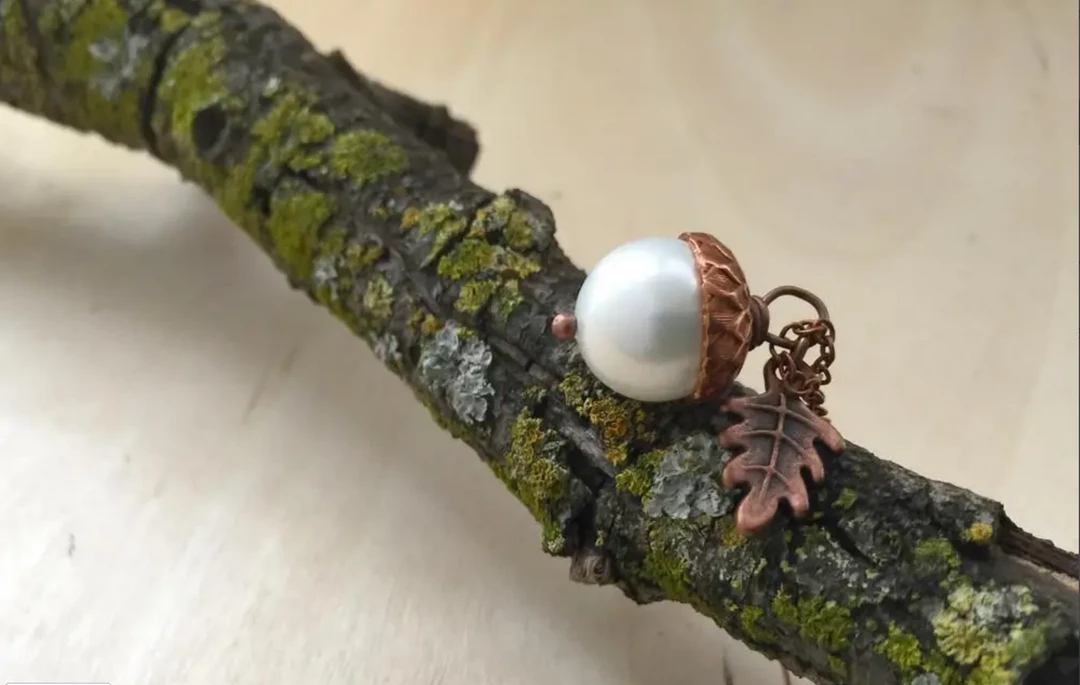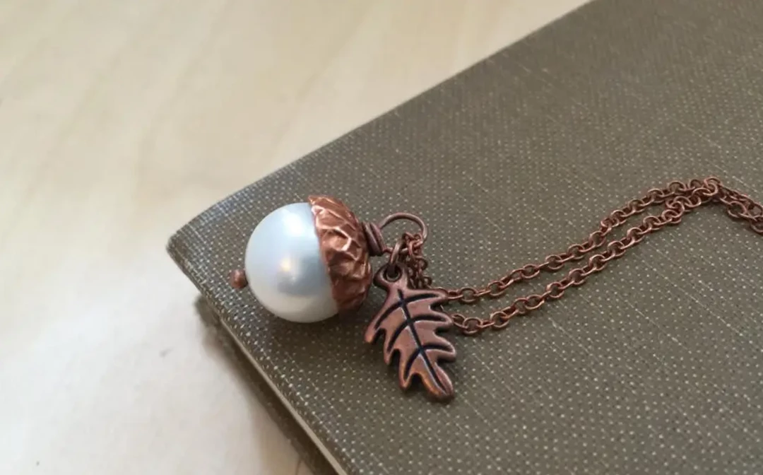 Here is a darling little acorn necklace featuring a beautiful snow white pearl coated bead in a copper acorn top. The Acorn measures at 12mmΒ and is accented with a silver oak leaf charm. This necklace comes on an 18″ chain.