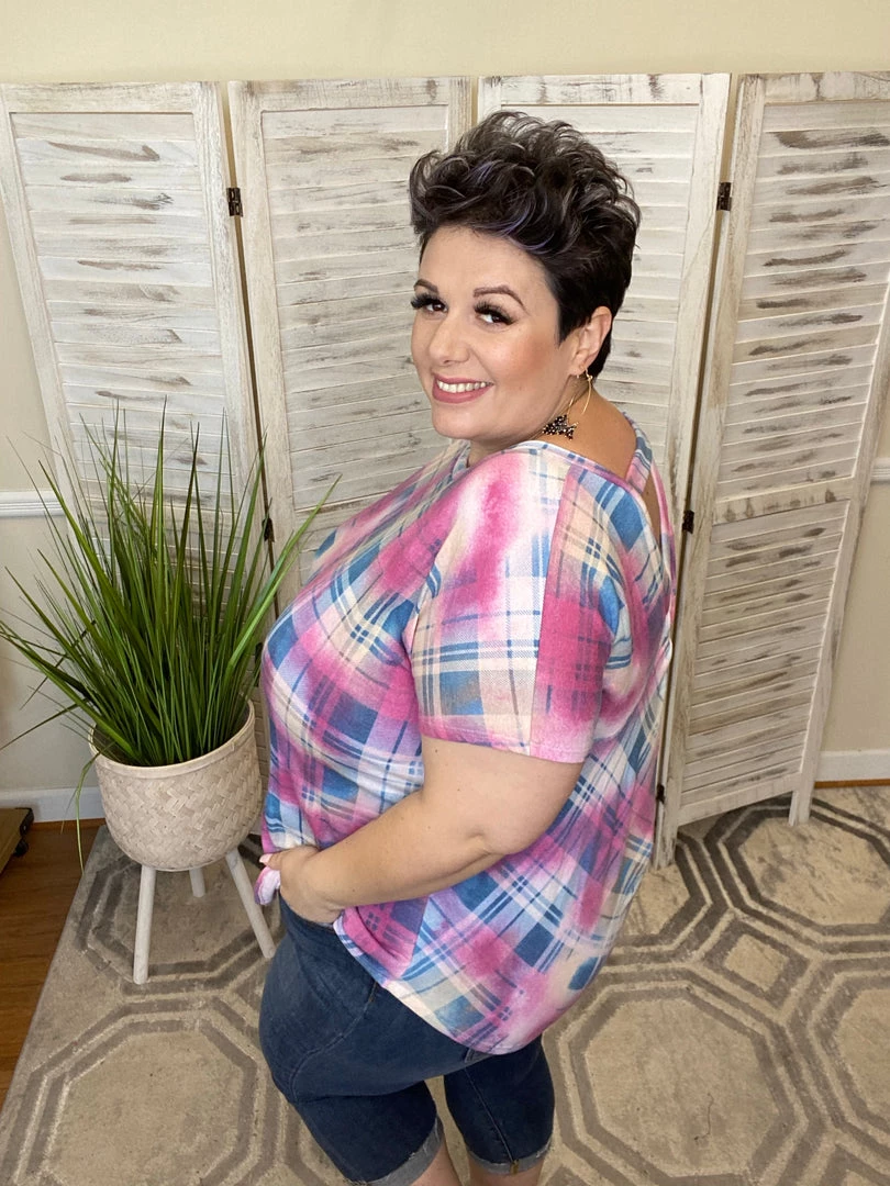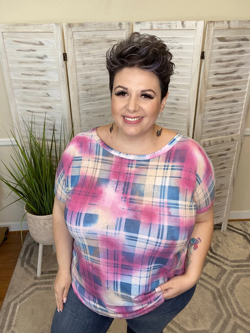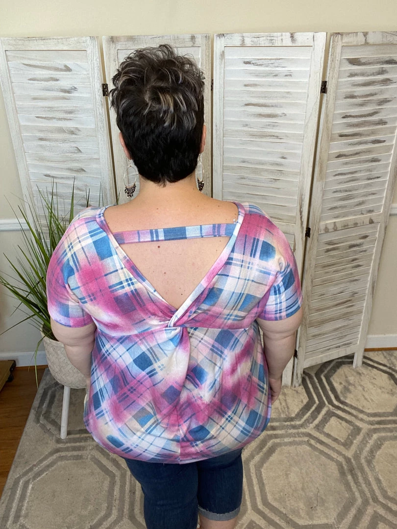 This beautiful plaid top features a twist back design that is sexy and oh so flattering. With it’s magenta faded spots on it, this top is the perfect casual wear!Β