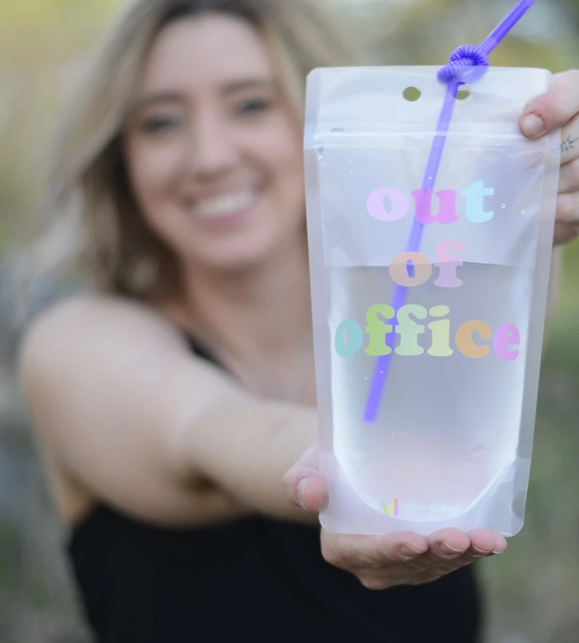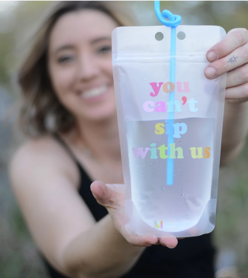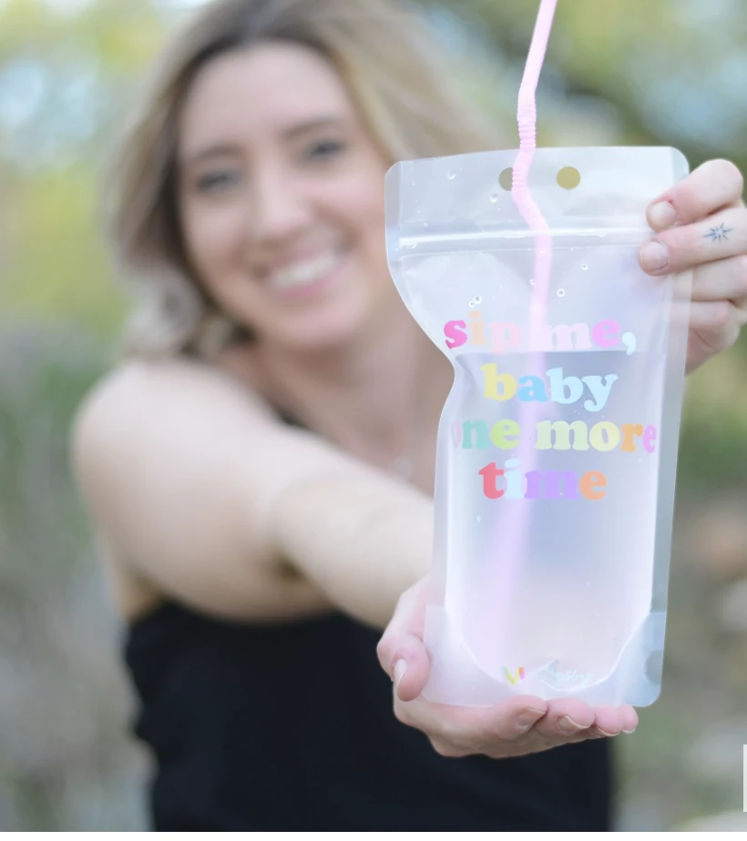 These awesome drinking pouches are the perfect accessory for any outing. These pouches are re-usable and easily travels with you without taking up much space. You can easily walk around with this using the two holes at the top as finger holes.