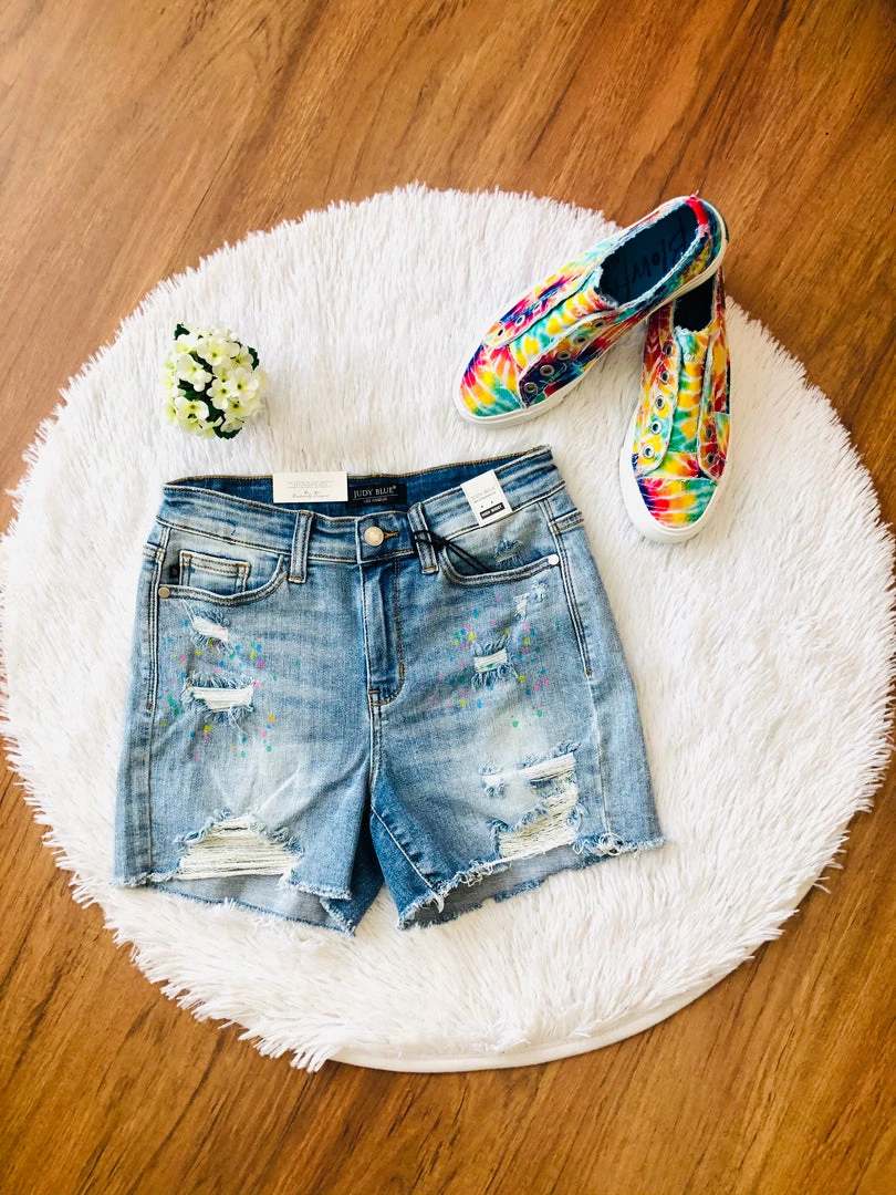 These amazing high waistedΒ rainbow paint splatter shorts feature heavy distressing and gorgeous rainbow specks on it-making it look like a paint brush was flicked on to them. This bright and fun pair of shorts is sure to be a go-to pair for the summer!